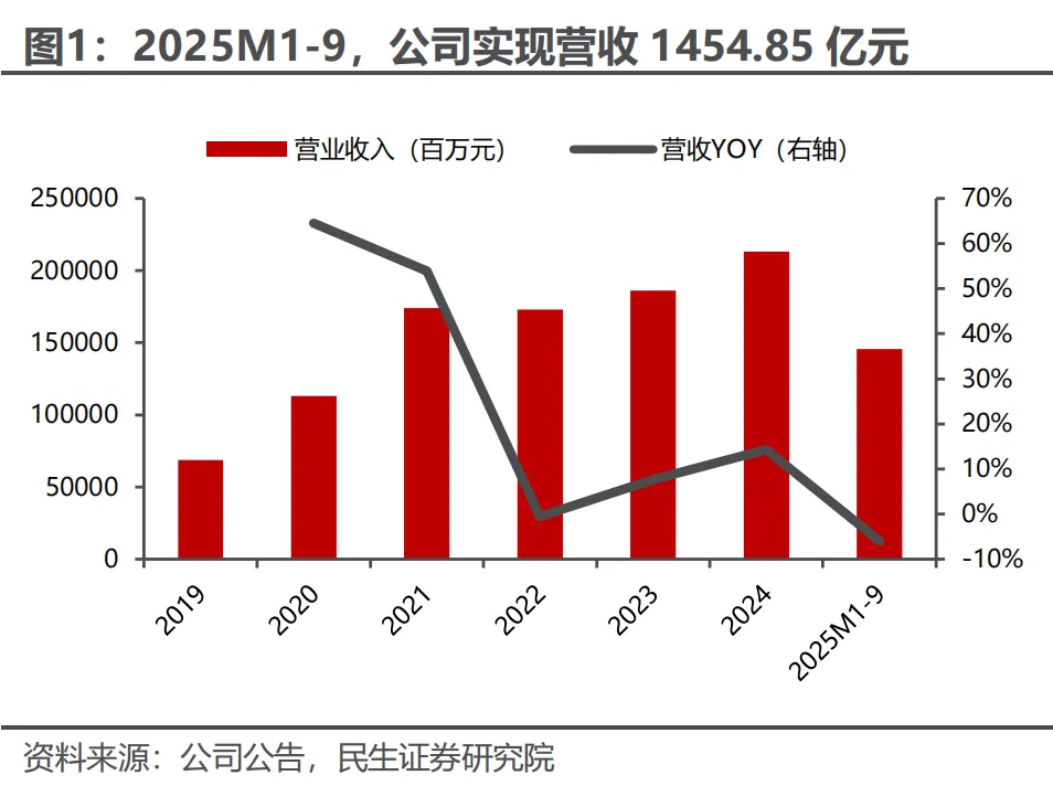 财务数据方面,2025年前三季度,公司实现营业收入1454.85亿元,同比减少5.99%,实现归母净利润142.80亿元,同比却大幅增长72.61%。