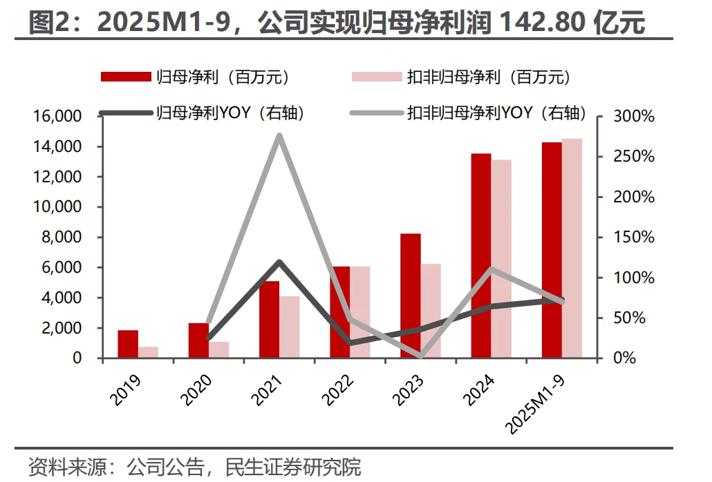 与此同时,公司迎来了业绩的炸裂增长。2025年公司归母净利润预计达到200-208亿元,同比大增47.80%-53.71%。