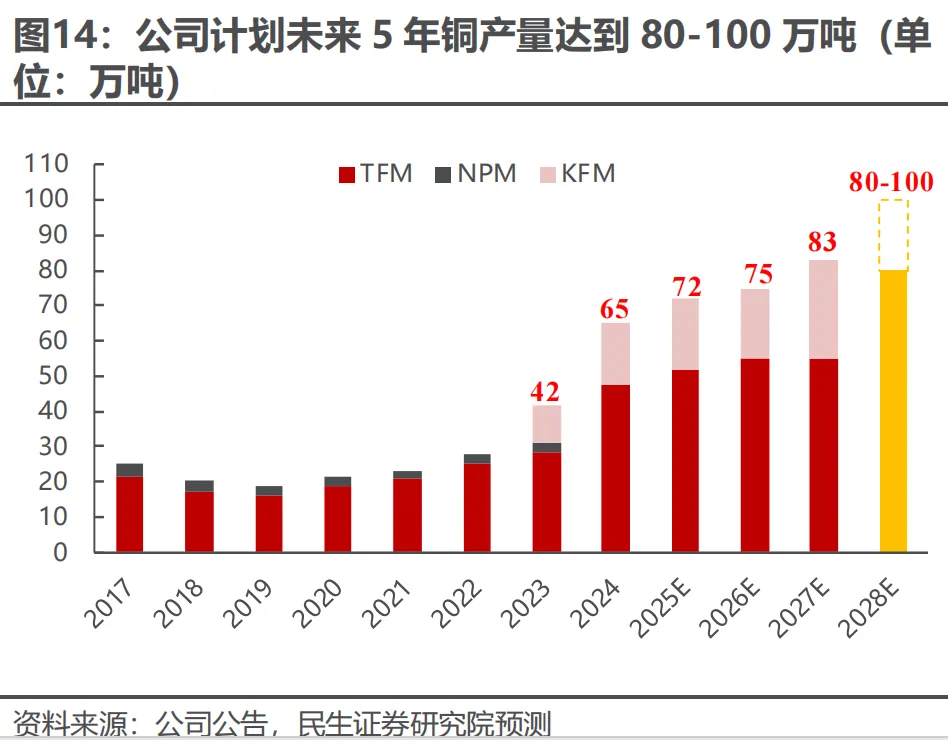 公司2026年铜产量指引为76-82万吨,若达上限将提前实现80万吨目标;KFM矿山二期建设预计2027年投产后,每年新增铜产量10万吨;TFM矿山扩产项目稳步推进,向2028年80-100万吨铜产量目标迈进。