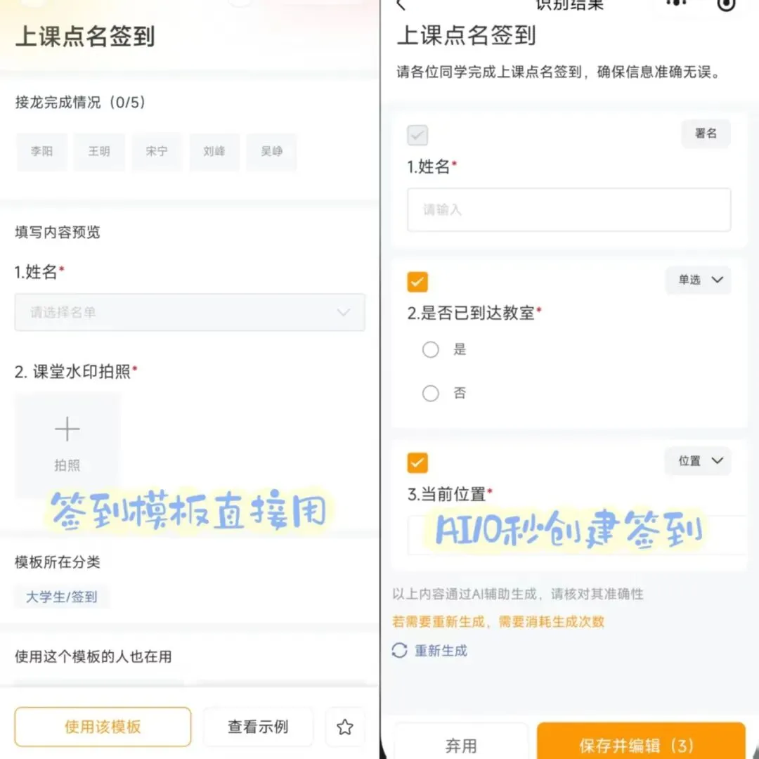 创建签到更省心:现成模板直接用,还能 AI 一句话生成(比如 “生成 305 教室下午 2 点签到接龙”)。学生点链接或扫二维码,按提示填信息,30 秒搞定,上课再也不用等签到!