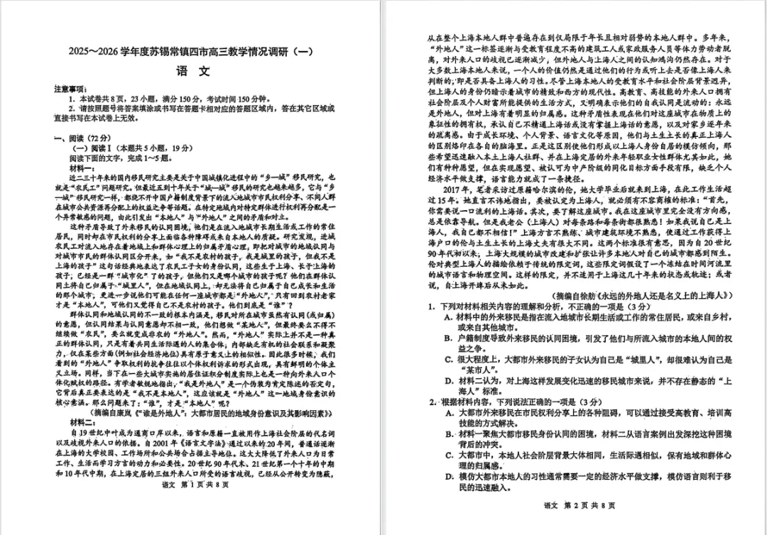 2026年苏锡常镇一模语文丨pdf文件下载(另赠数学卷)