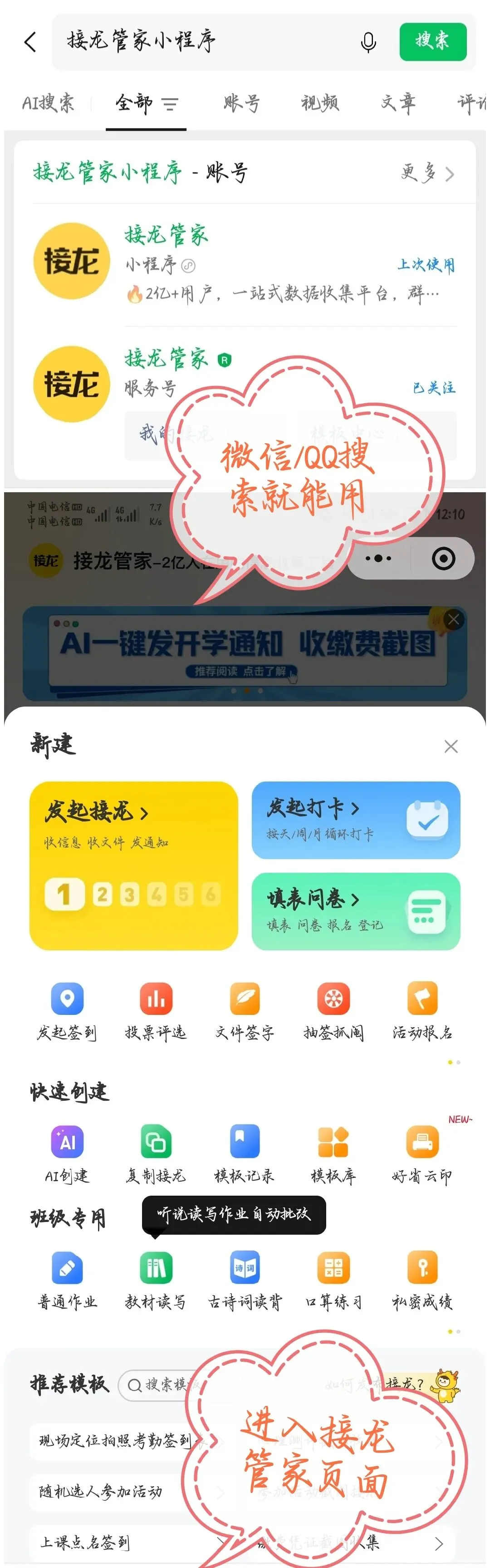学生最烦下载新软件,接龙管家是 2 亿人都在用的小程序,搜一下就能进,不用装 APP、不用注册、不用记密码,一键登录,3 秒进入签到页面,学生用着没负担!
