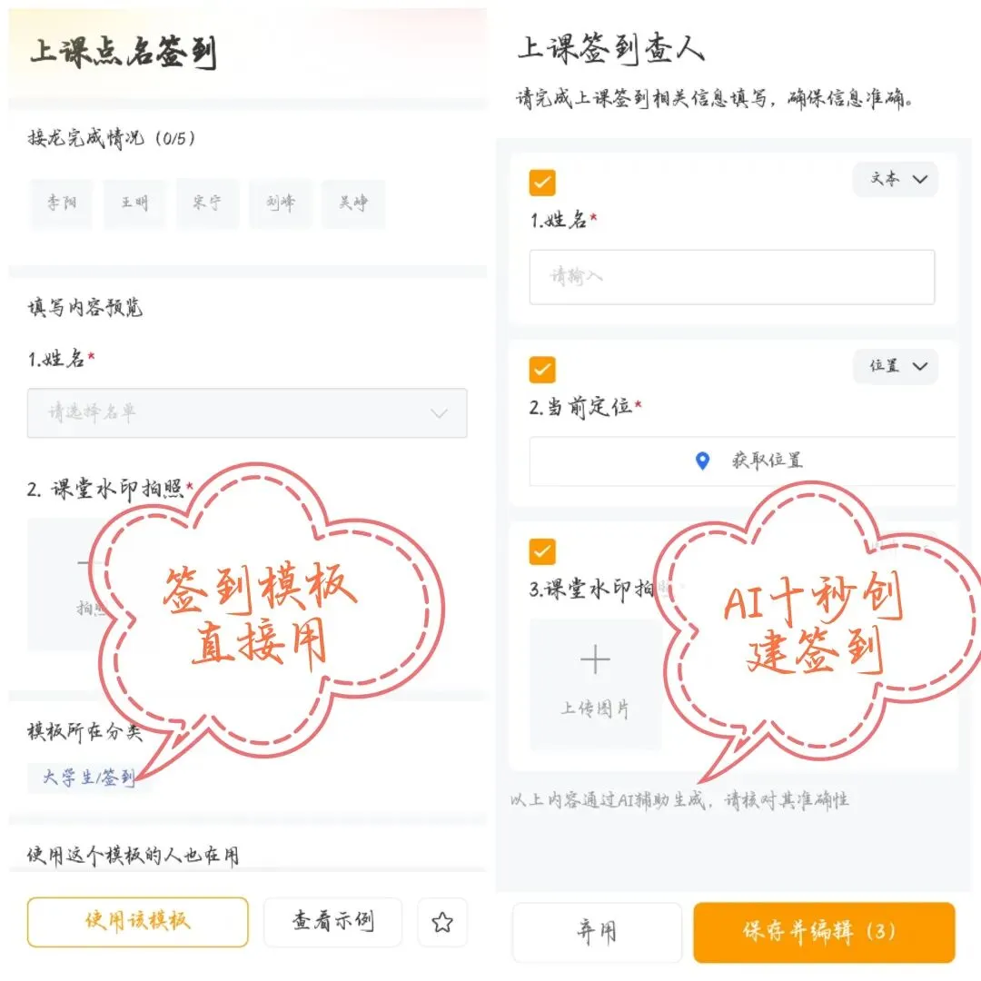 创建签到更省心:现成模板直接用,还能 AI 一句话生成(比如 “生成 305 教室下午 2 点签到接龙”)。