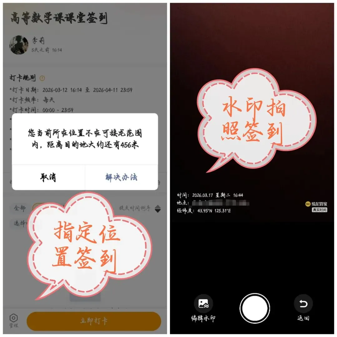 水印拍照签到:上传课堂照片,自动带时间地点水印,假照片根本混不过去;