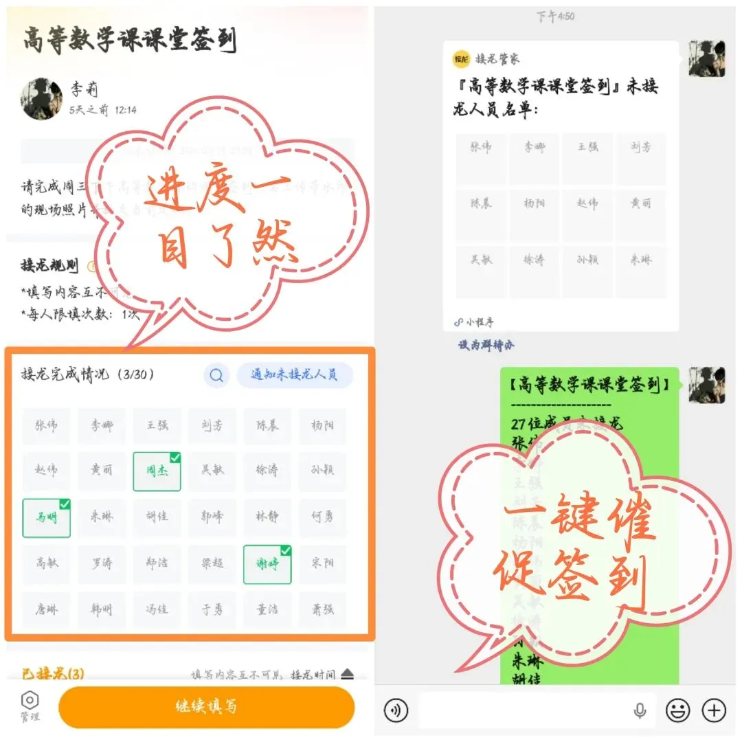 30 秒发起签到,操作简单到 “零学习成本”接龙管家界面超友好,老师和班委 5 分钟就能上手。