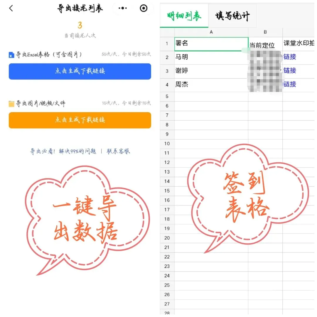 签到结束,接龙管家自动生成详细出勤表,包含签到时间、地点、照片等信息,直接发给学校存档。班委再也不用熬夜手动统计,工作效率翻倍!