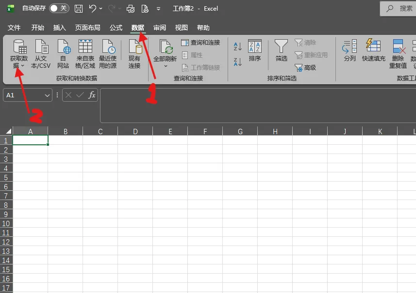 在新建的 Excel 中,点击上方菜单栏的 “数据” (Data) 选项卡。