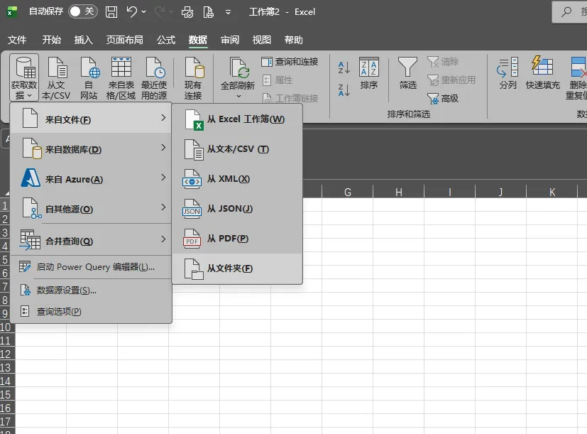 点击 数据 -> 获取数据 -> 来自文件 -> 从文件夹。