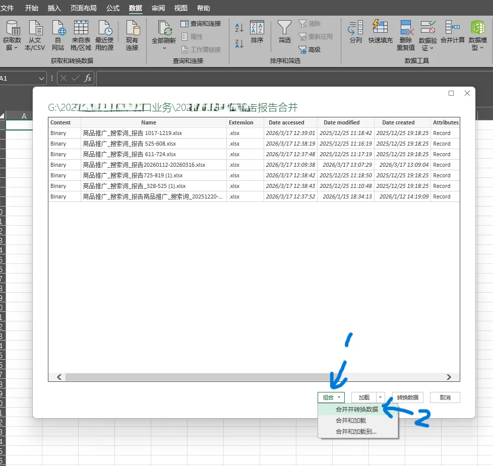 此时会弹出一个列表窗口,显示文件夹内的所有文件。点击底部的 “合并” (Combine) 下拉按钮,选择 “合并并转换数据” (Combine & Transform Data)。