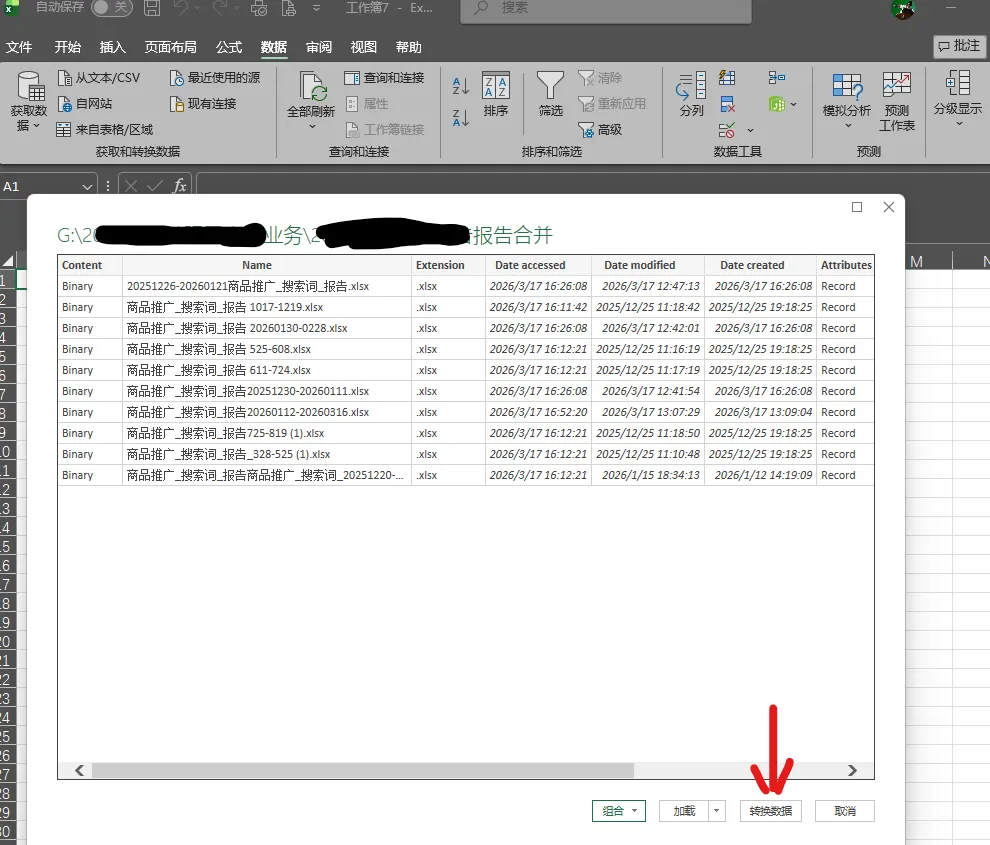 在弹出的预览窗口中,千万不要点击底部的“合并”按钮,直接点击旁边的 “转换数据” (Transform Data)。