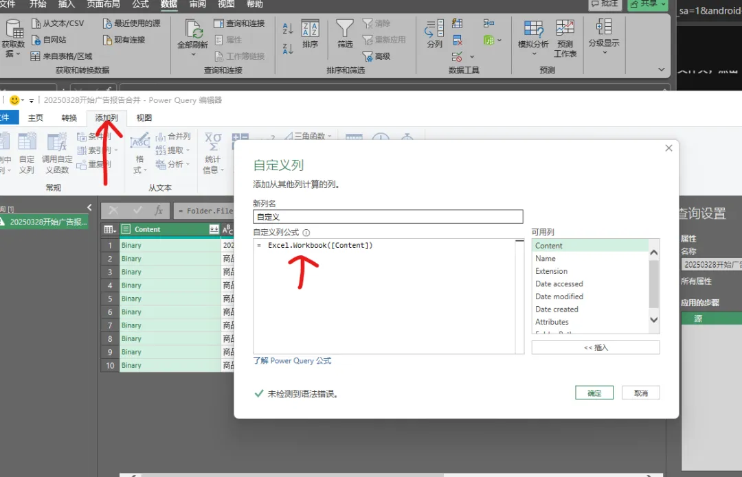 此时会进入 Power Query 编辑器窗口。你会看到所有数据已经纵向堆叠在一起,并且多了一列