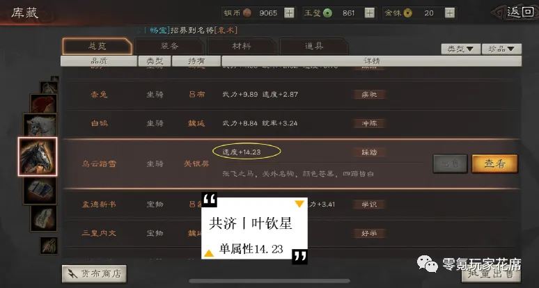 游戏中一个装备最多自带15属性,而单属性装备尤其难得,大部分都止步于10-12单属性,这匹乌云踏雪单速度属性有14.23,是目前花席见过“单属性”最高的装备了。