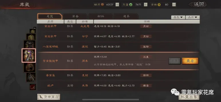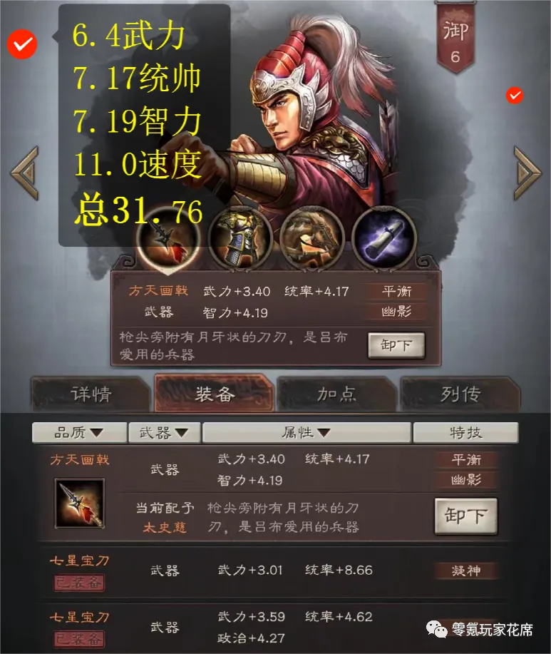 带平衡的武器属最强的,这一支方天画戟包含6.4武力、7.17统帅、7.19智力、11速度,总计31.76属性,几乎等于3红的属性了。