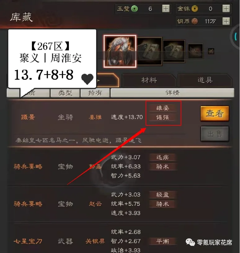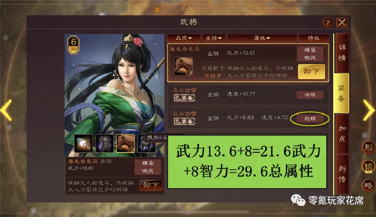 武力单属性13.61,嘶风增加8武力,这就是21.61武力属性了,等同于给关银屏增加了2红的属性。雄姿还能增加8智力属性,如果是速度或者统帅就极品了。