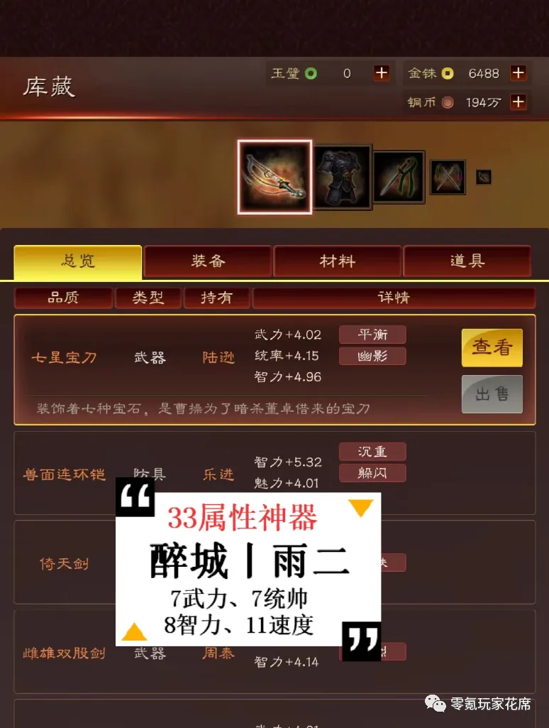 这一柄七星宝刀属性上更强,7.02武力,7.15统帅,7.96智力,11速度,总计有33.13属性,比前面的方天画戟更强,只是武力属性不适合陆逊,用起来有些吃亏了。
