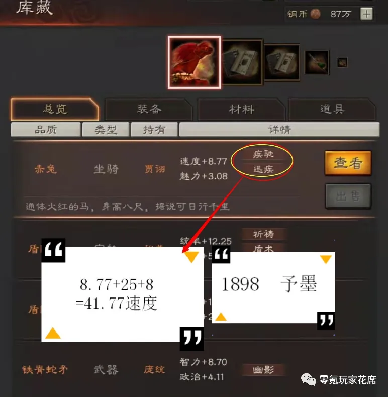 疾驰开局25速度,迅疾8速度,加上战马原有的8.77速度,他开局就有41.77速度,这还没算其他3个装备的,如果算上其他装备,开局60速度很容易达到。