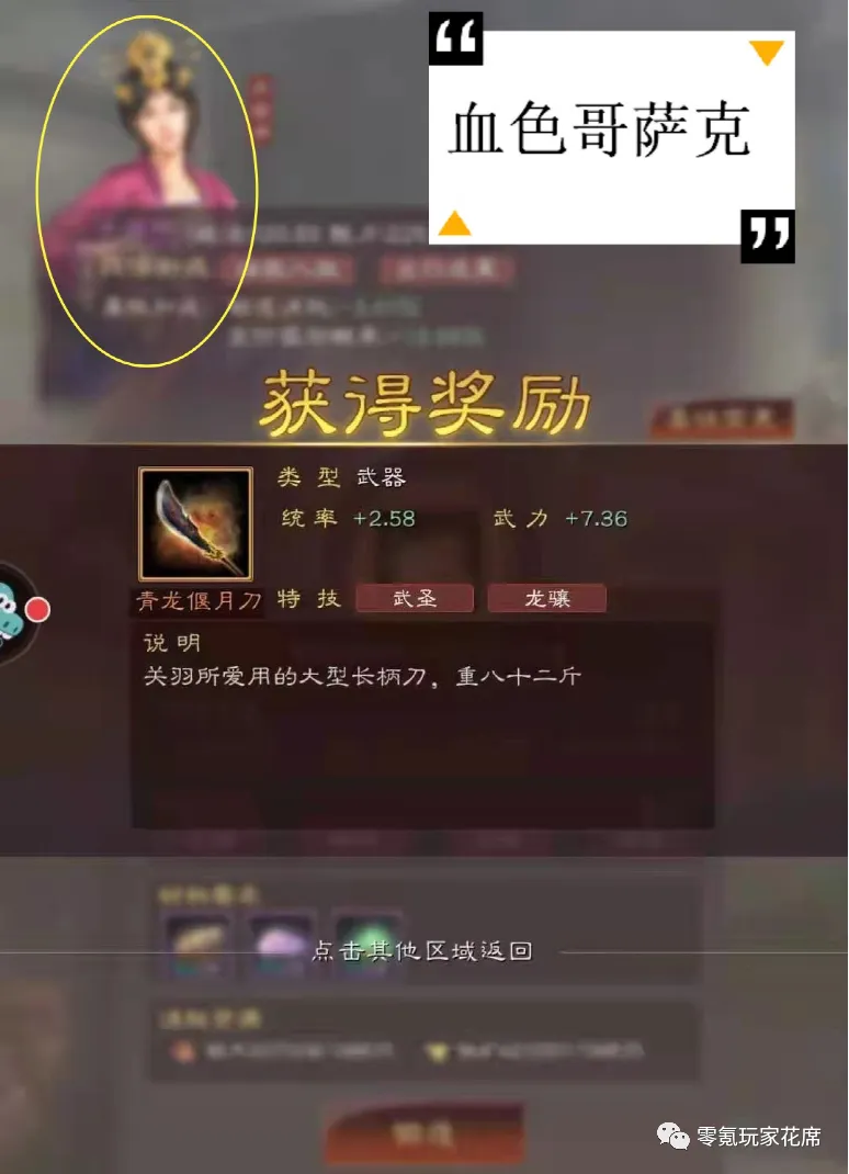 最后这件武器,花席不确定是不是粉丝P的图,因为太离谱了,青龙偃月刀上直接有武圣和龙骧两个特技,关羽和儿子要打起来了。