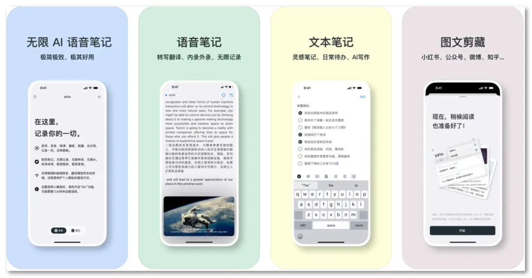 无需注册登录,打开即用,一直在更新完善,支持的功能包括:实时语音转文字、音频导入转文字、转录之后翻译文本、文本笔记、AI总结、AI深度问答、AI润色、AI纠错、AI优化扩写、网页剪藏、稍后阅读。inFin支持离线使用,当网络中断自动切换为离线模式,所有数据本地存储,加密存储在手机本地,保护用户的数据安全。