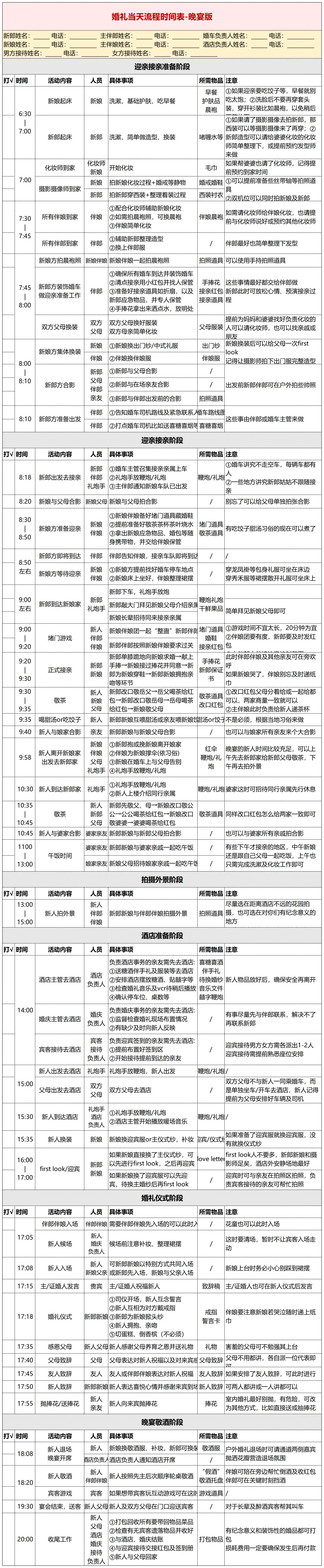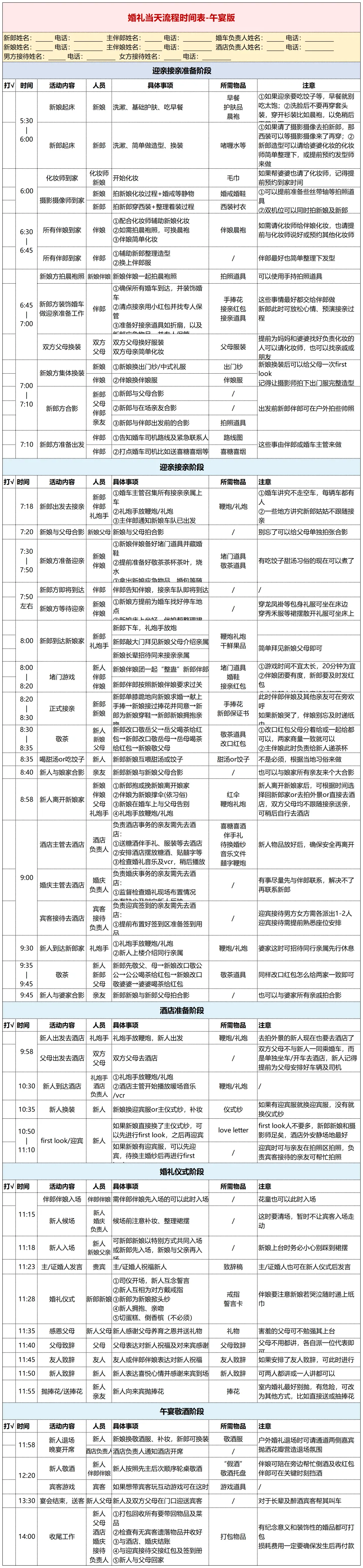 迎亲接亲阶段——从出发到新娘家、堵门游戏、敬茶改口、合影,连谁负责放礼炮都写清楚了