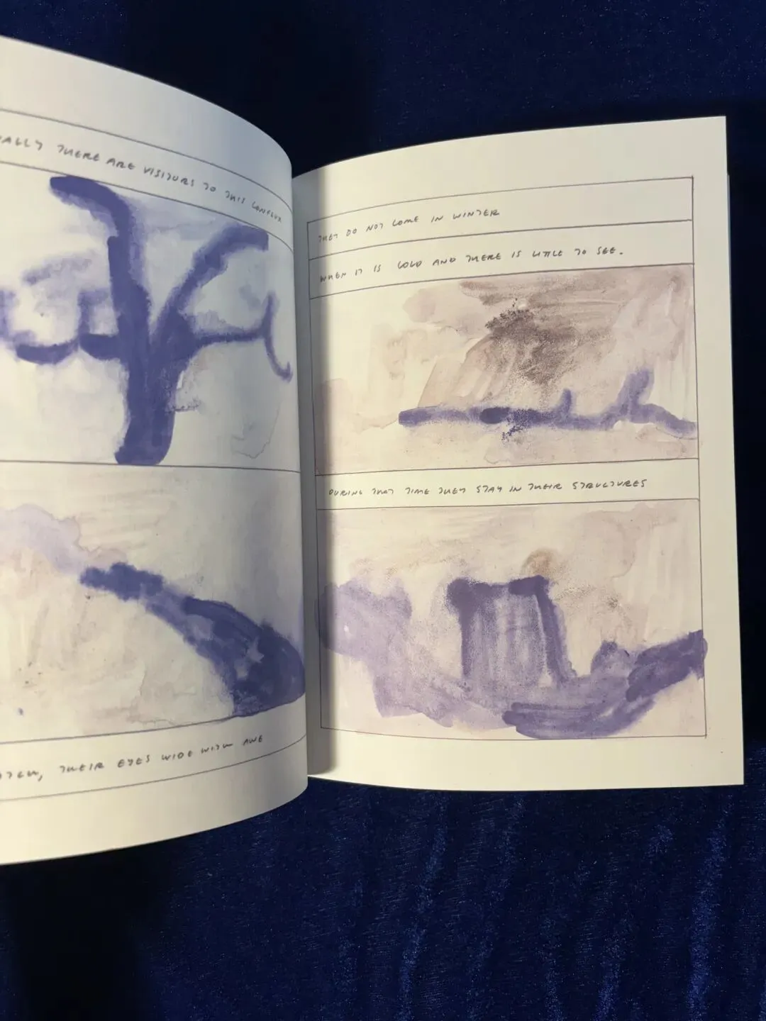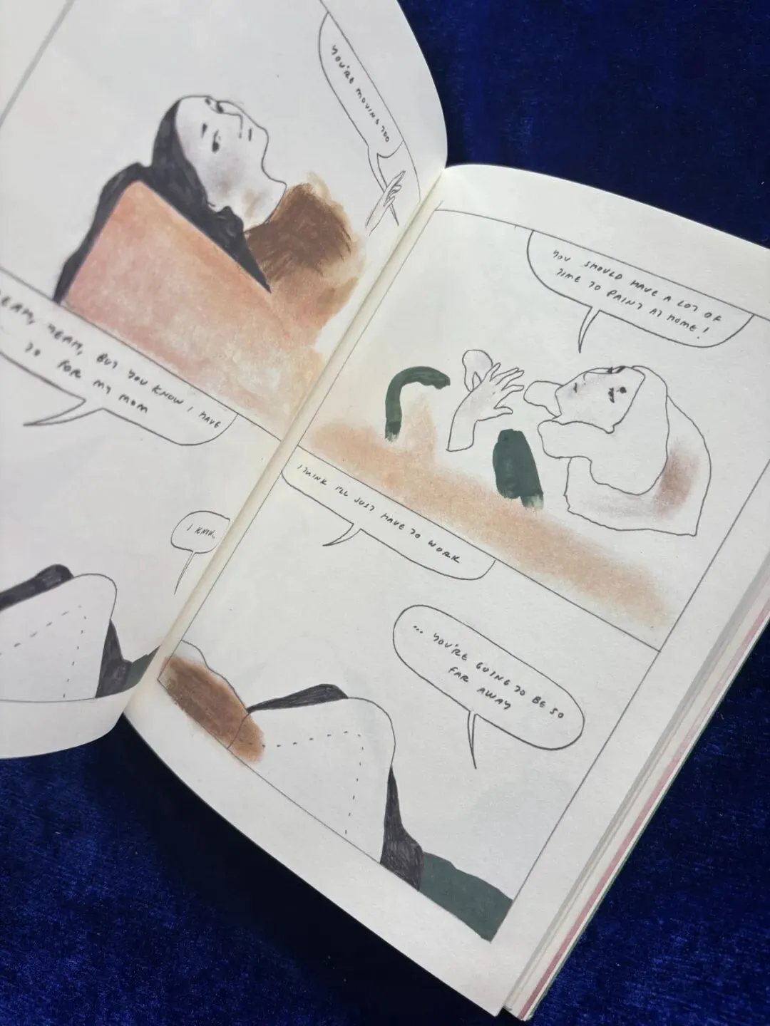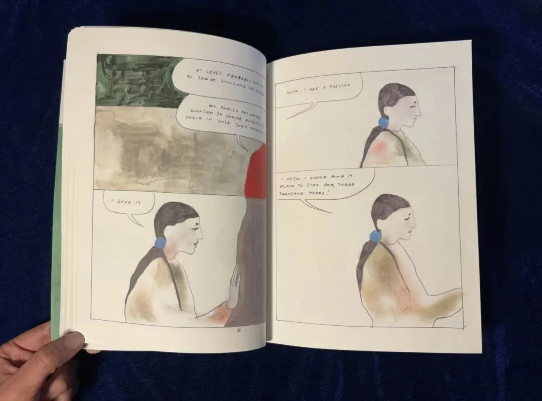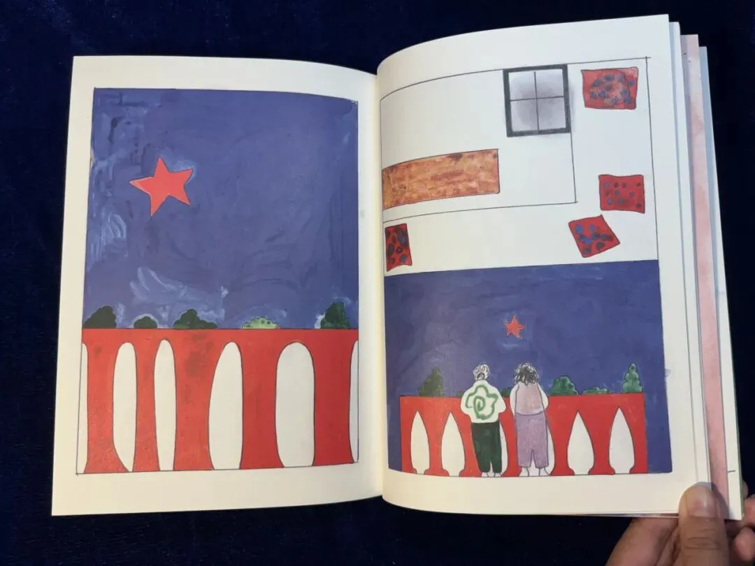 交谈的人回归了现实,此时我看两人房间里的枕头是血红色的,上面洒着蓝点,像是太阳星星里洒满了细碎的天空。过去与未来,自然与人间打破了界限,融为了一体。