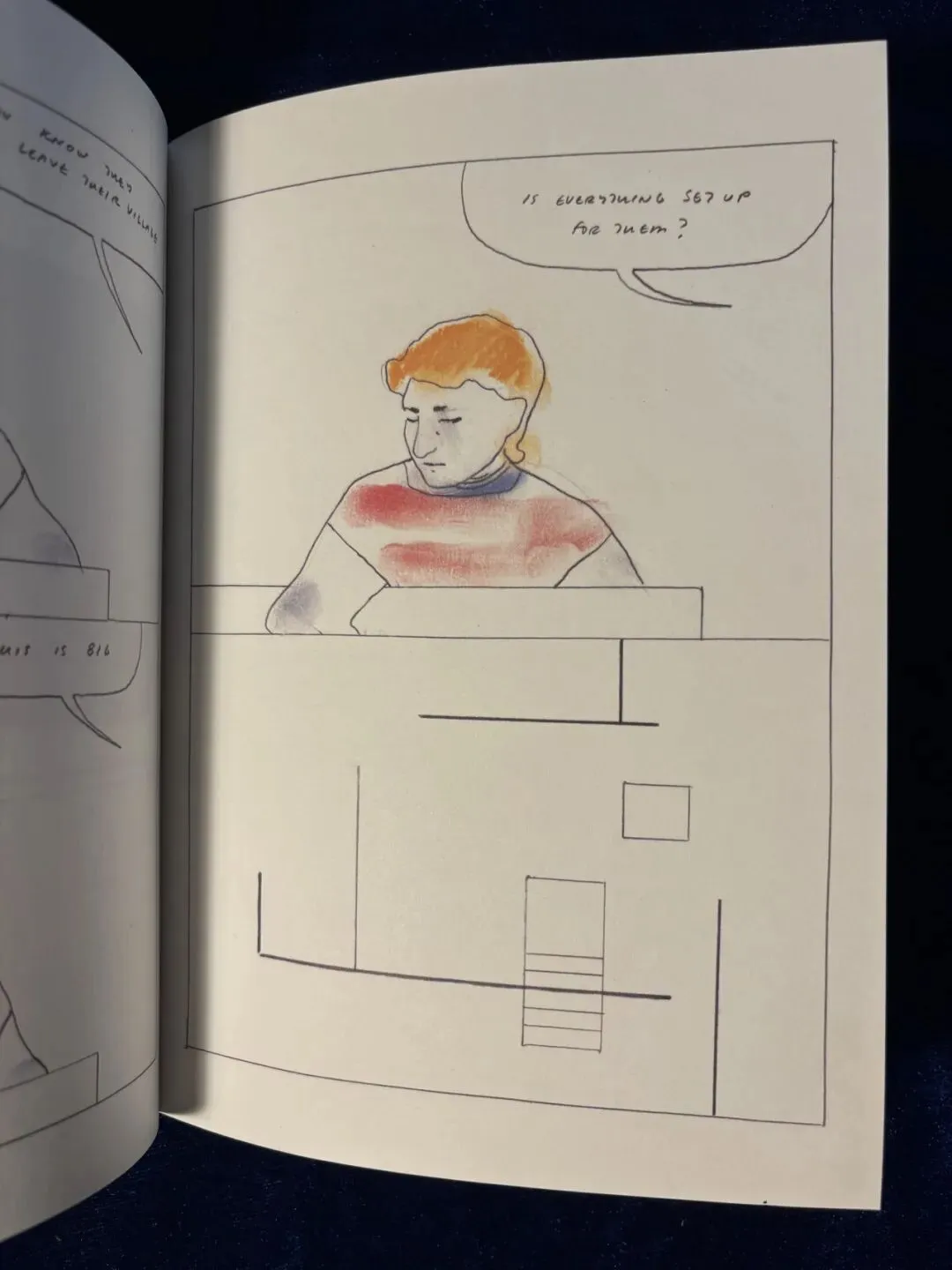 杨正说着话,接下来似乎觉察到了什么,他转过头去。下两页画面的右下角是垂着头的丽沙,她眼角微微向下撇,眼神中含有微妙的不舍,淡淡的寂寞和克制的愤懑。刚才提及家人的时候,丽沙说“他们从未离开自己的村庄”,不经意间透出了她面对自己生活现状的不满,以及她不愿承认的,自己对不同生活潜意识里的向往。