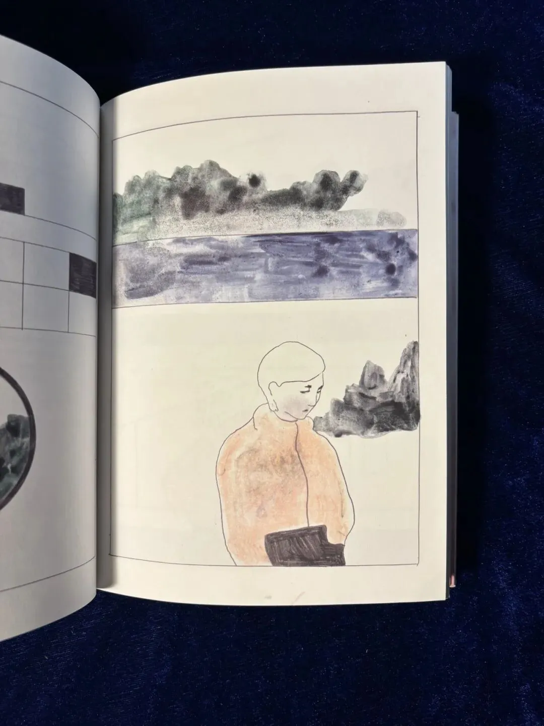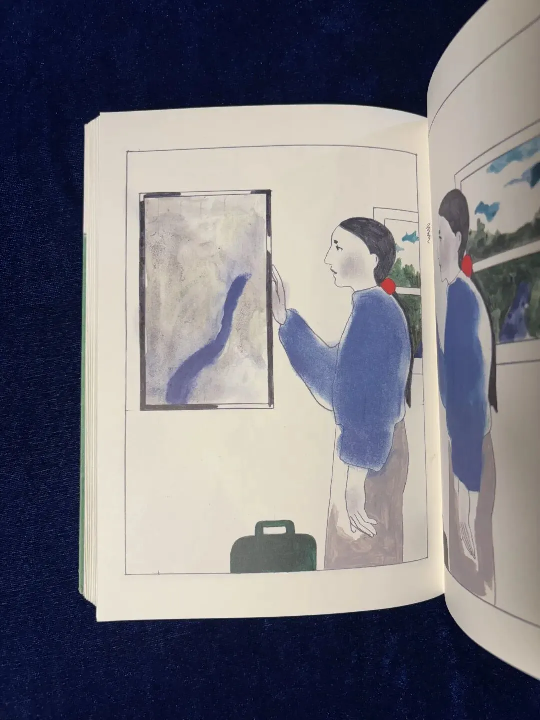 这一页的上半部分是长方形中的河流和不规则的绿色的山,整体结构让我想起了第三章女子触摸石头的画面构成。相似的排布,映照了两个人参差对照的心。丽沙的稳固中藏着对远方的期许,女子触碰远处的决断中亦闪现出对驻留的眷恋。跨越章节,两个不曾向彼此吐露心声的人,在科赫的画笔下隔空对话。