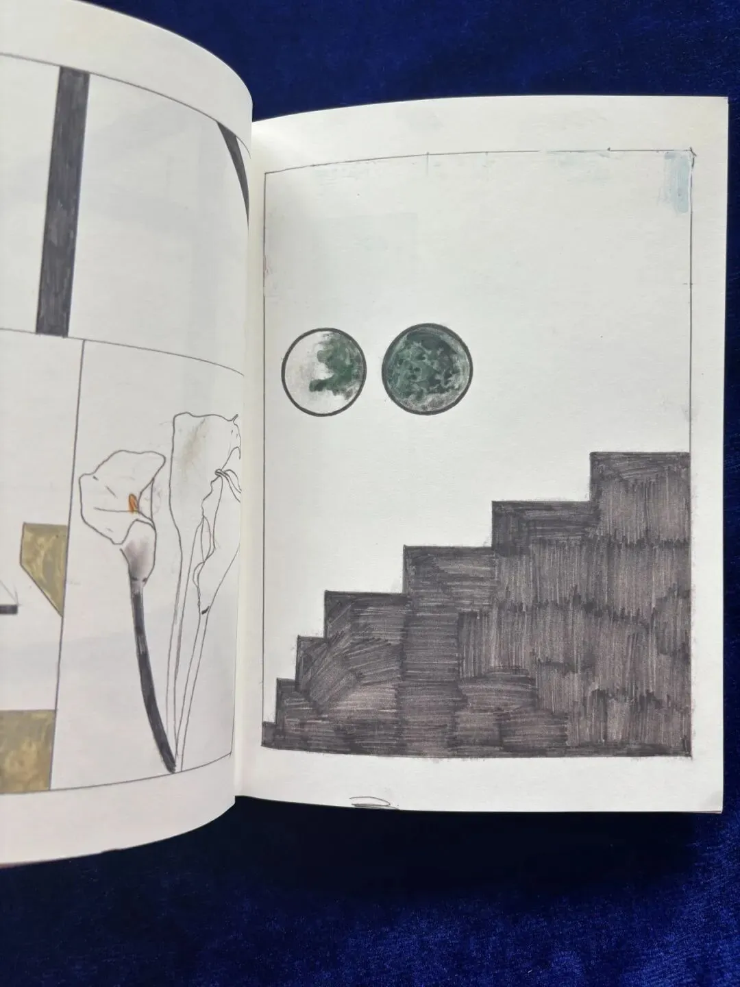 丽沙出现在右页,左页则是空镜,唯有房屋的结构静静呈现:科赫将房屋解构成向下的阶梯状黑色块面,具有强烈的象征意义。第一章有同样的处理,向下或向上呈阶梯状的房屋形式穿插在人与人的谈话间,暗示了人物的情绪与选择。
