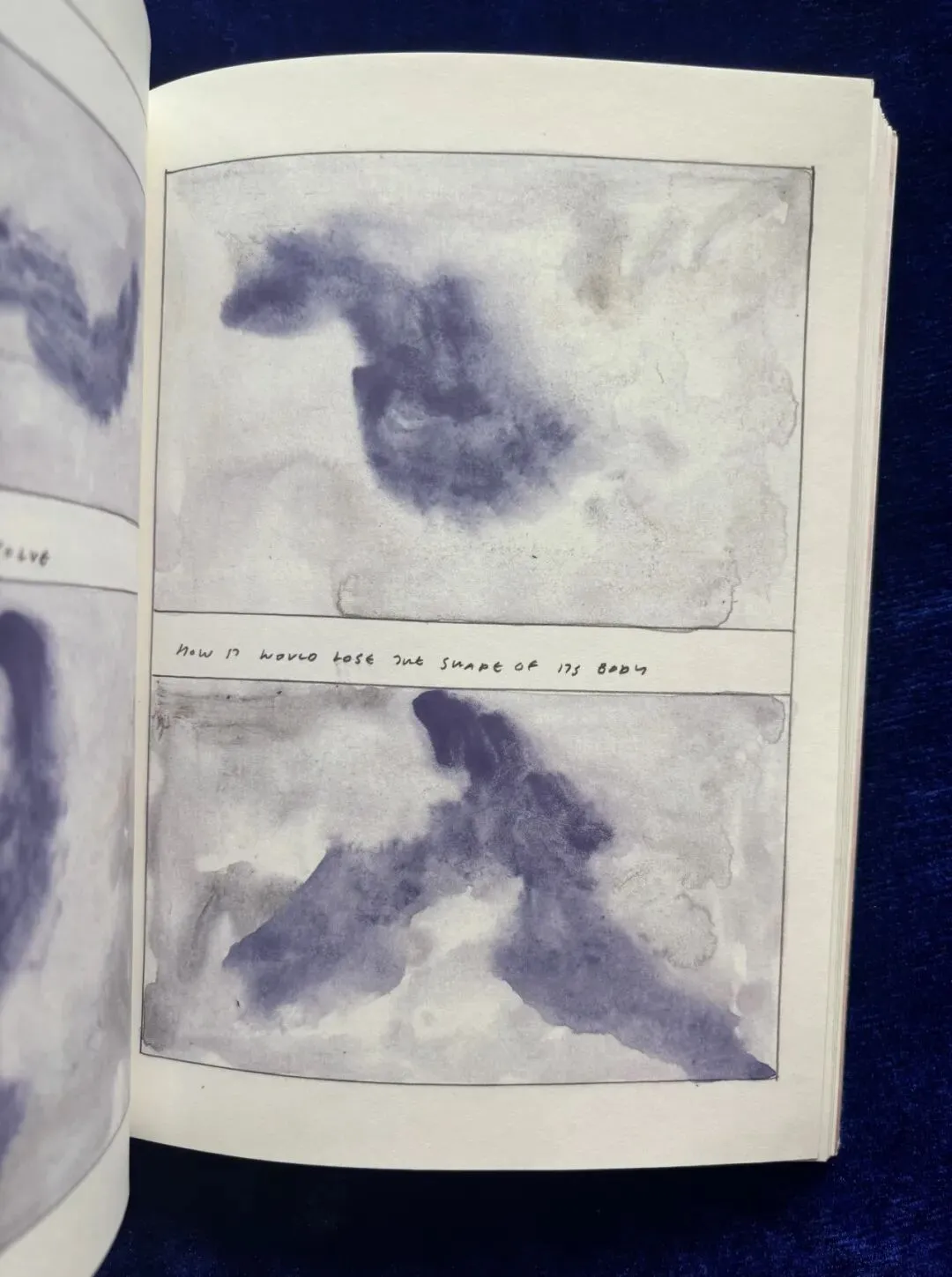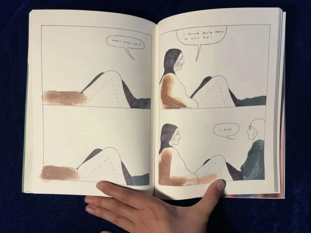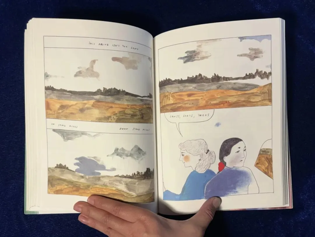科赫单拎出来两页画车窗外的风景,四个规整的方形将窗外凝重缤纷的景色束缚住,似乎暗喻女子思想的挣扎。车窗下是空白的方框,理应有文字诉说心绪,但车窗有话,人则无言。