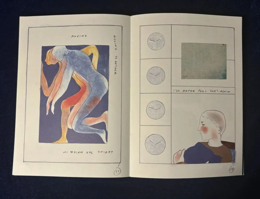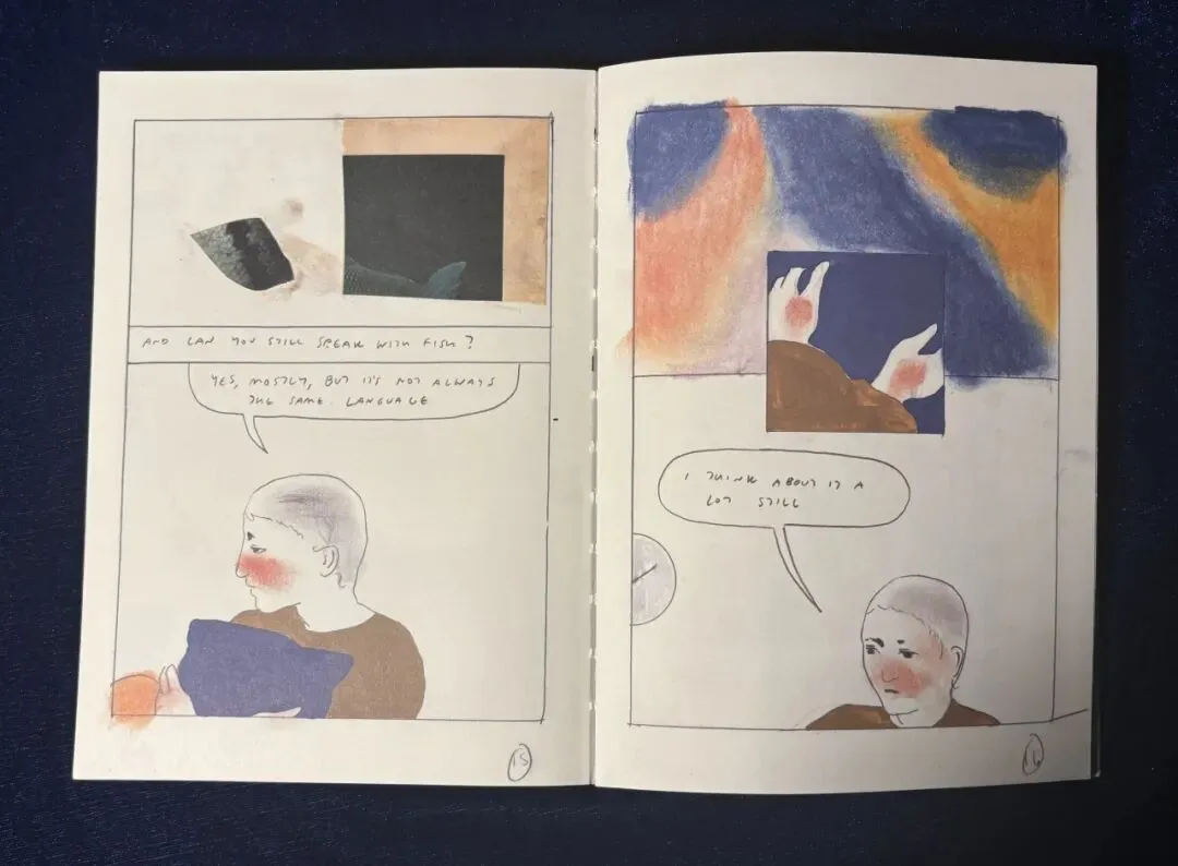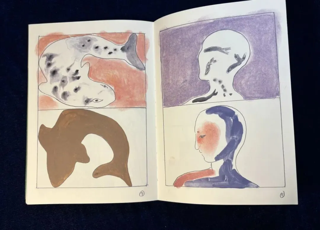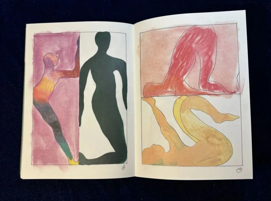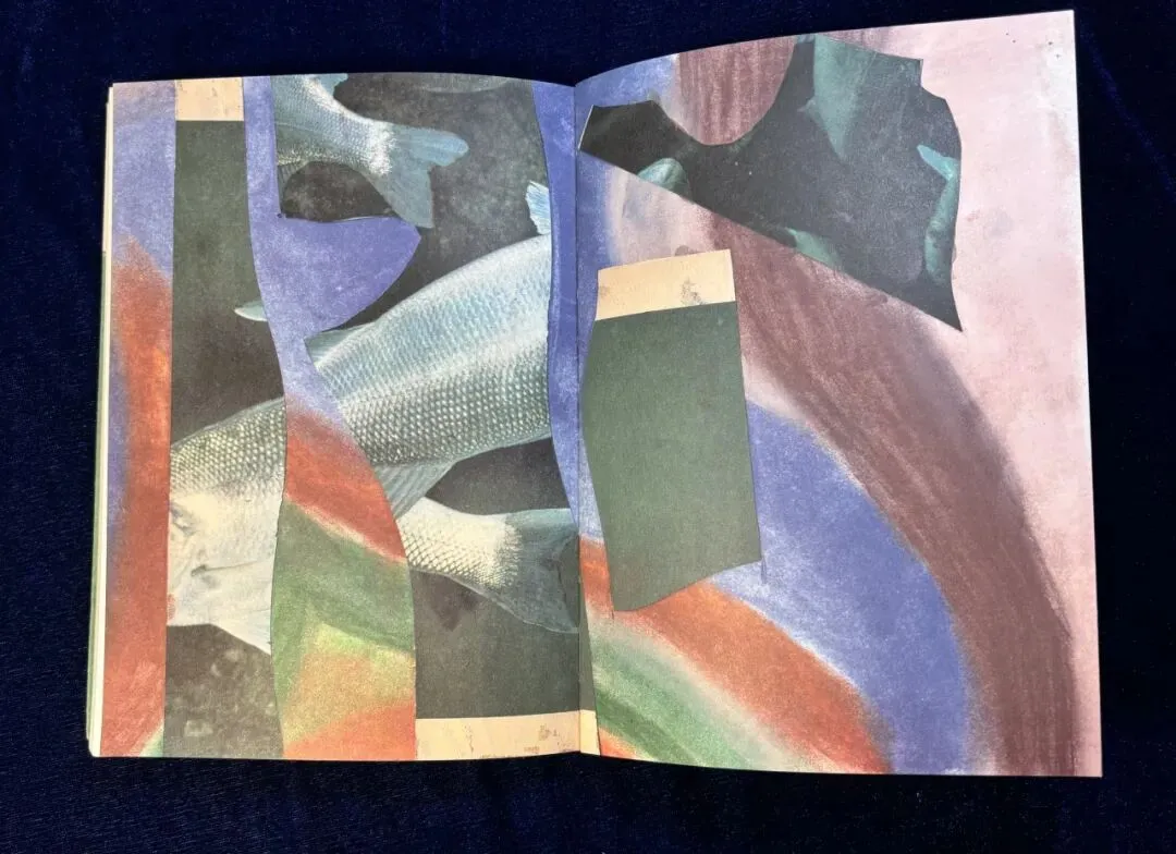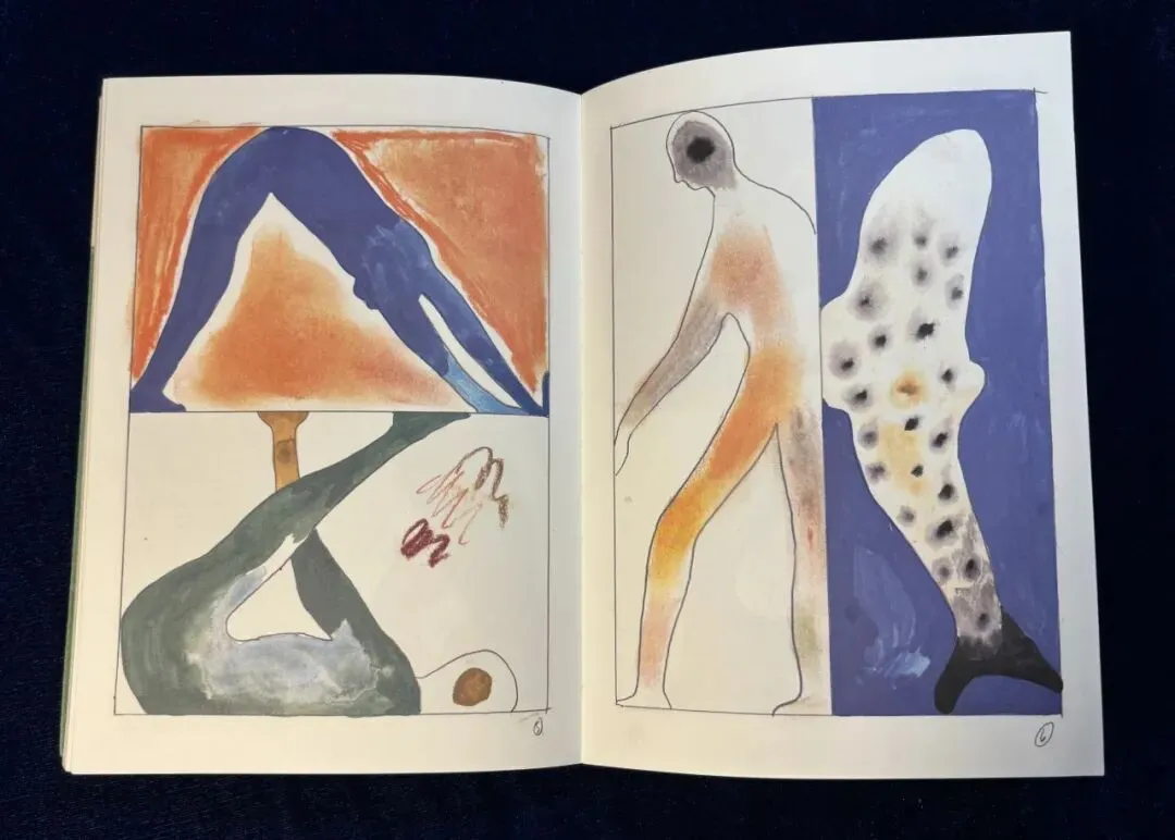 支撑的、翻滚的身体,红色、蓝色、土色,在舞蹈的姿势里翻流。白里透橘的鱼,身上落上了黑色的斑点,白里透橘的人身上亦落上了黑色的斑点。右页,白色带橘色的鱼在蓝色中游动,左页,蓝色的人在橘色背景中像桥一样架起来,多么具有联结感的设计!
