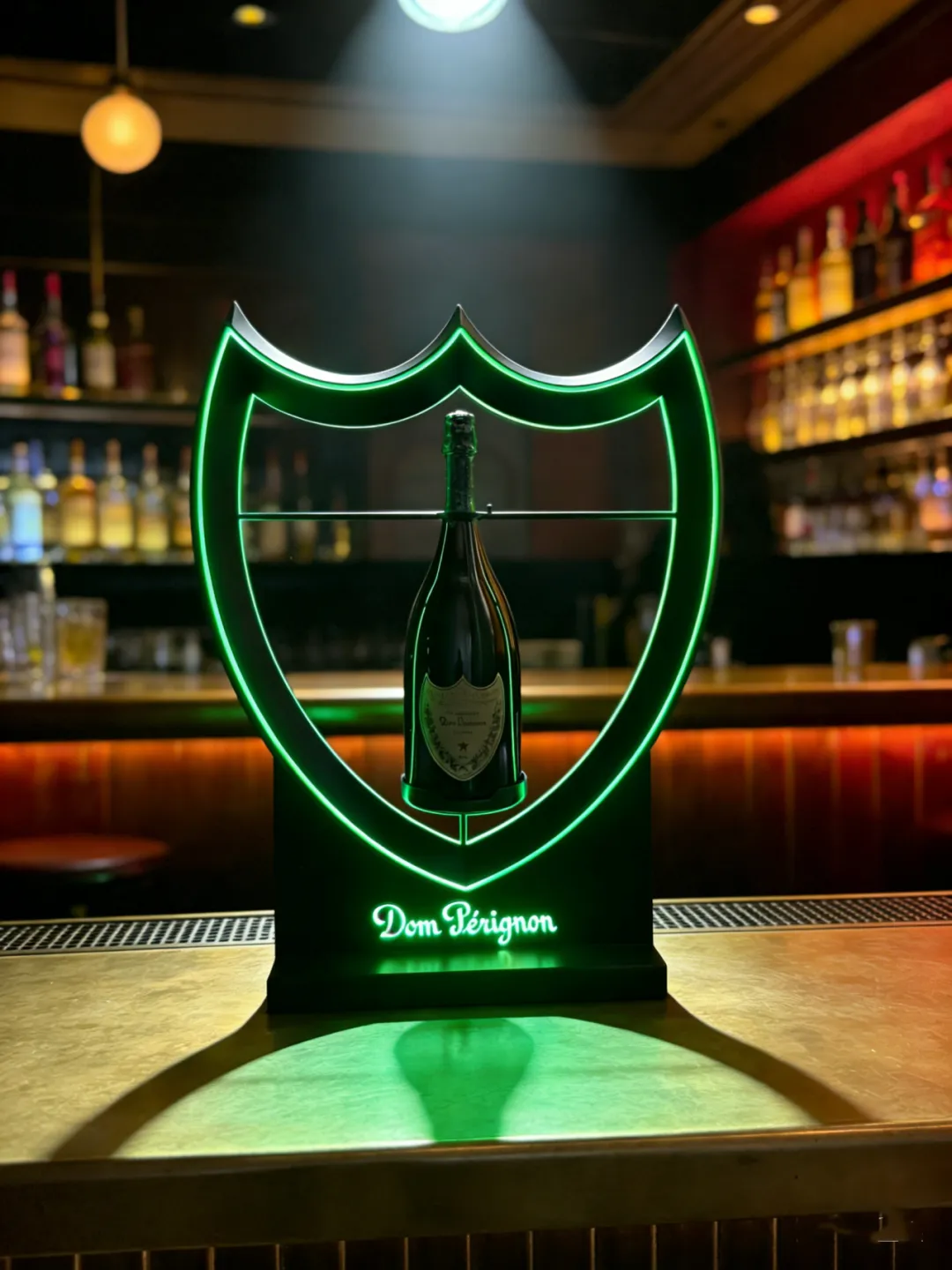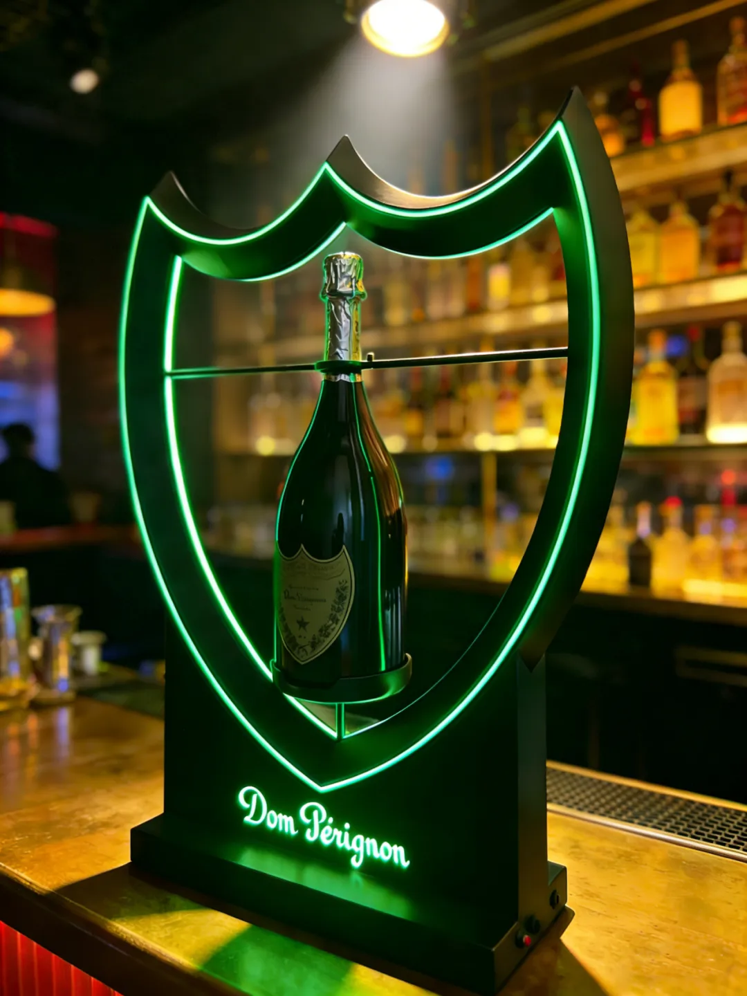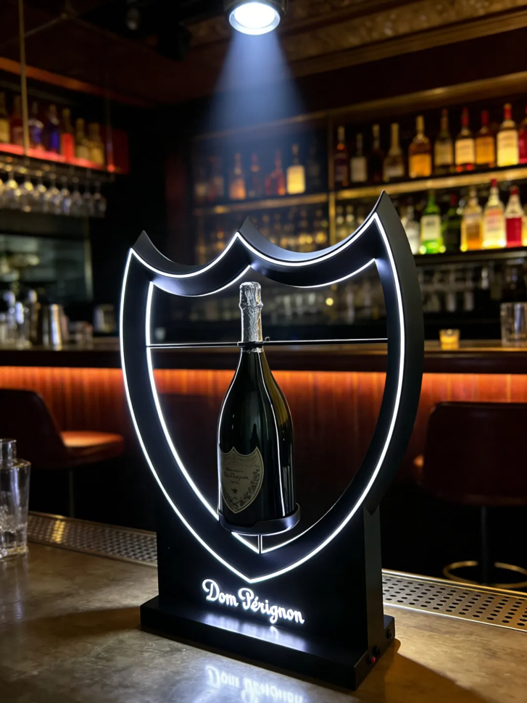 纯净白光:明亮通透,照亮酒标细节,让 Dom Pérignon 的精致标识清晰可见。灯光柔和不刺眼,既不会掩盖香槟本身的光泽,又能在昏暗环境中成为视觉锚点。