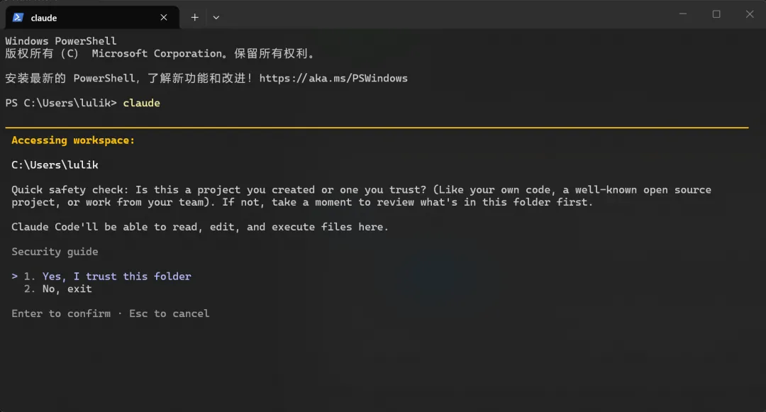 💡 小知识:这个界面我们后面会简称为 CLI(Command Line Interface,命令行界面)。之后提到的”在 CLI 中输入”,就是指在这个界面里说话,不是在 PowerShell 里。