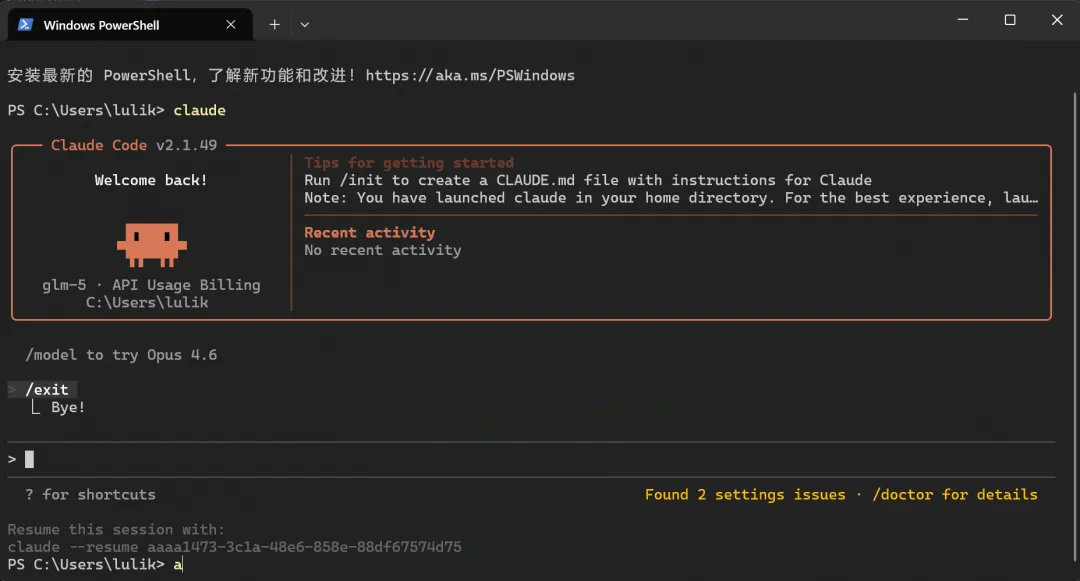 然后在 PowerShell 中重新 claude 启动