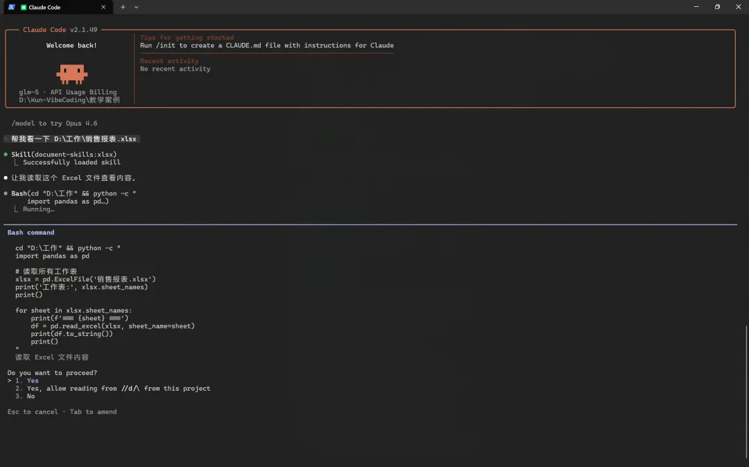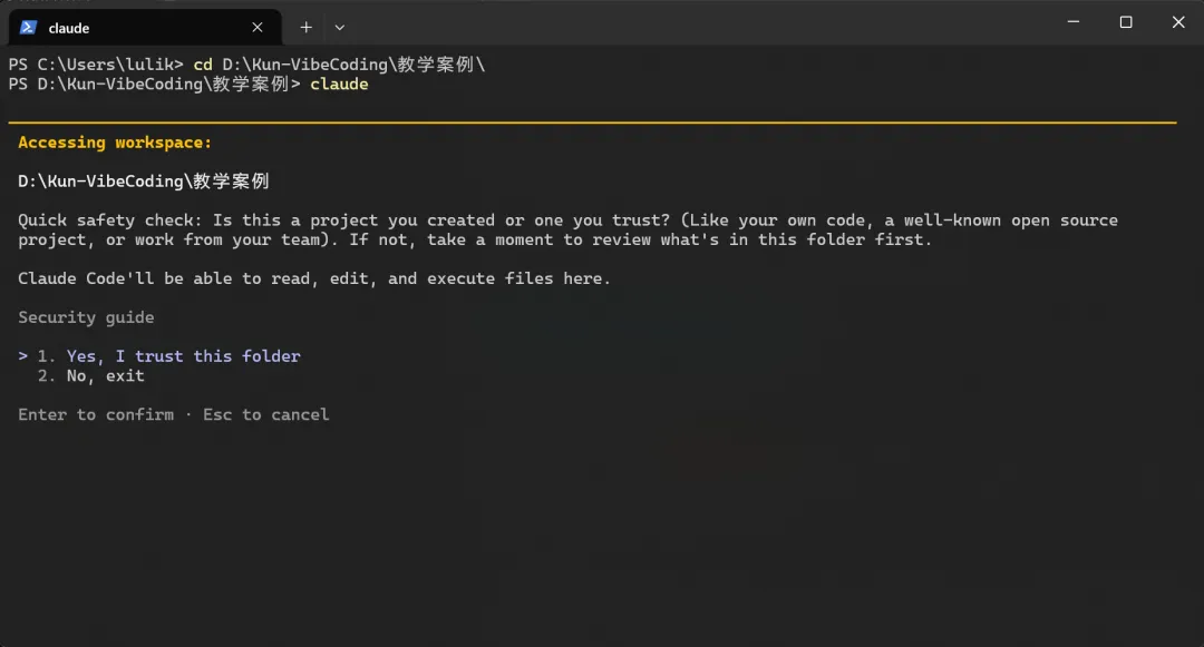 💡 先说明一下:权限确认是正常现象,即使你进入了正确的工作目录,Claude Code 也会在你第一次操作某个文件时询问你是否允许。这是安全机制,不用担心。只要你确定工作目录是对的,这些权限确认就都是”可控”的。