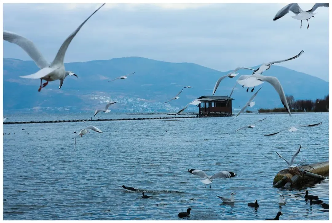 这张照片的拍摄思路核心在于动静结合与前景点缀,通过系统的学习,操控快门与构图营造出了极具生命力的画面,左上角和右上角的海鸥作为强前景,不仅占据了视觉重点,还通过“半框”构图切割了画面边缘,瞬间拉高了空间的纵深感和临场感,让观者仿佛置身于场景之中。海鸥呈散点式分布在画面中高空,水面水鸟则点缀在下方,形成了“上中下”三层空间结构。使用高速快门定格了海鸥展翅飞翔的姿态,对焦区域覆盖了中高空的主要鸟群,确保飞行状态下的主体清晰。这张照片通过自由飞翔的生灵与静谧安稳的湖水/亭子的强烈对比,讲述了一个关于“自然生机”与“岁月静好”并存的故事,既有视觉冲击力,又有情绪的舒缓度。
