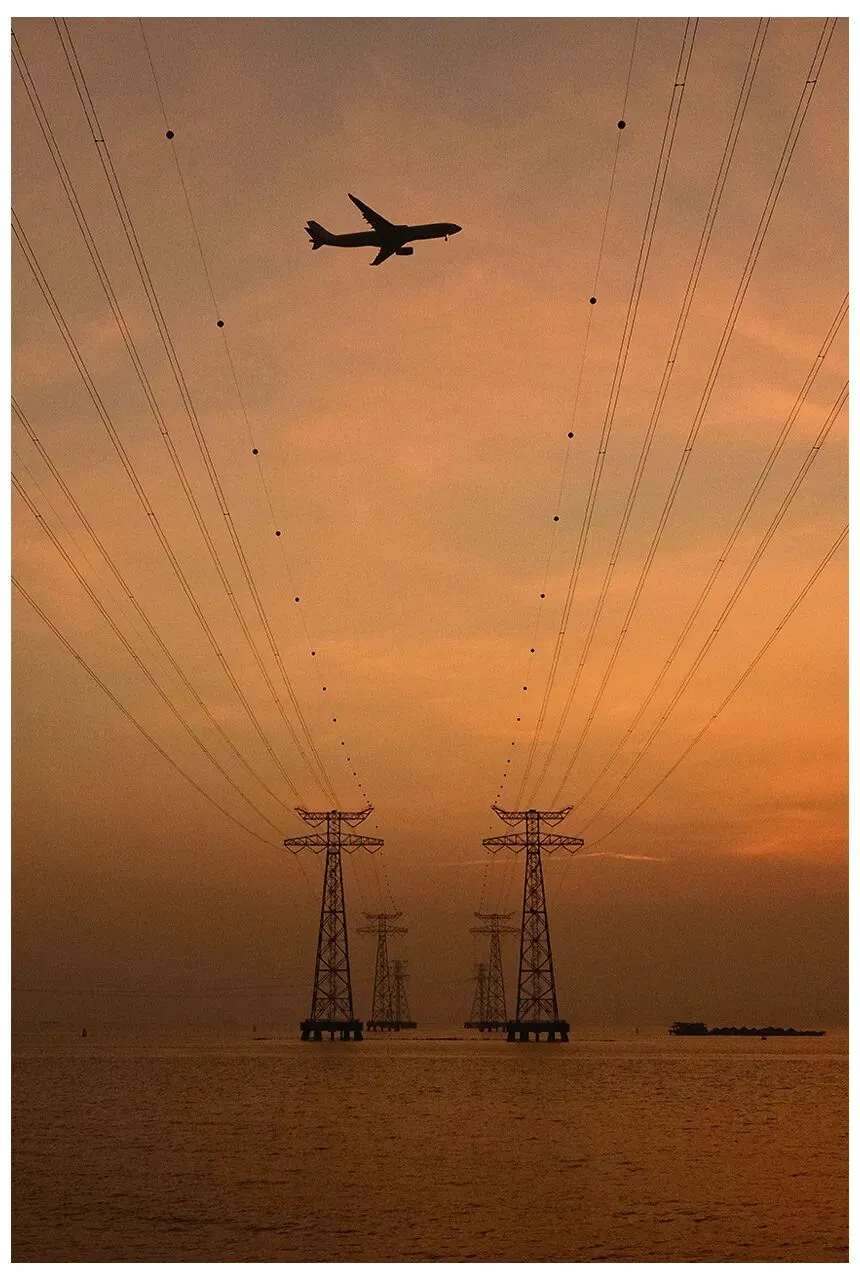 首先,利用电线与铁塔的线条,引导视线汇聚至中心的飞机,强化空间纵深感。其次,采用剪影对比手法,突出黑色轮廓与暖色调天空的强烈反差,提升画面张力。第三,选择黄金时刻,用橘色晚霞与静谧海面打造柔和温暖的基调,让工业线条与自然光影融合,传递安静、治愈且充满希望的氛围感。总结:这张照片以黄昏时分的海岸为背景,将飞行轨迹、城市工业线条与落日余晖融为一体,用镜头记录下现代生活里温柔又治愈的瞬间。