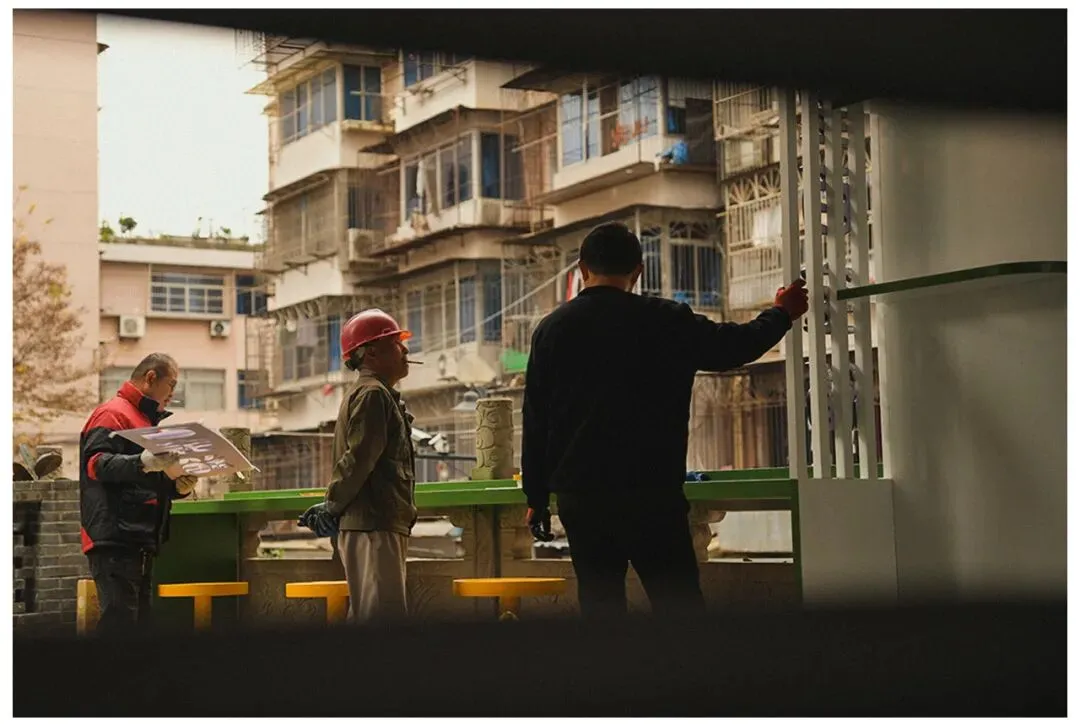 参数光圈2.8,快门速度1/125,ISO-100,焦距55。本意是想拍摄一些老城区的扫街,当时正好是傍晚左右,因此整体使用了暖色调,我原本计划是拍摄其中一位工人,在这张图片拍摄之前我已经拍摄了十几张左右,但都不是很理想,碰巧此时三个工人站在了一起,我就借助旁边的栏杆做了一个简单的框架构图,形成了这张成片。