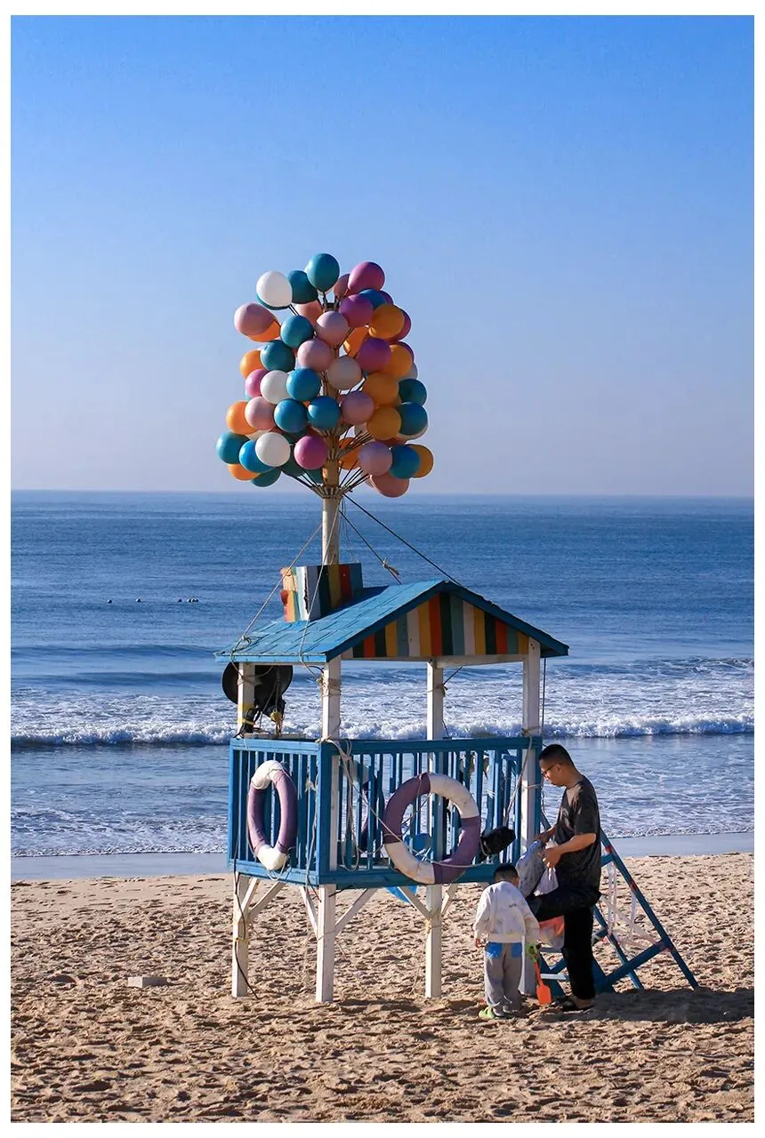 佳能60D/ef55-200。拍摄参数:67mm,1/1250秒,f8.0,iso200。拍摄思路:第一眼见到小木屋时很嫌弃上边的假汽球,没有感觉,在回程时见到了一对父子走向沙滩,直到他们走到小木屋就按了快门。梦幻般的蓝色背景,阳光下的彩色汽球,父亲陪伴的孩子。第一印象就是《飞屋环游记》里的形象。