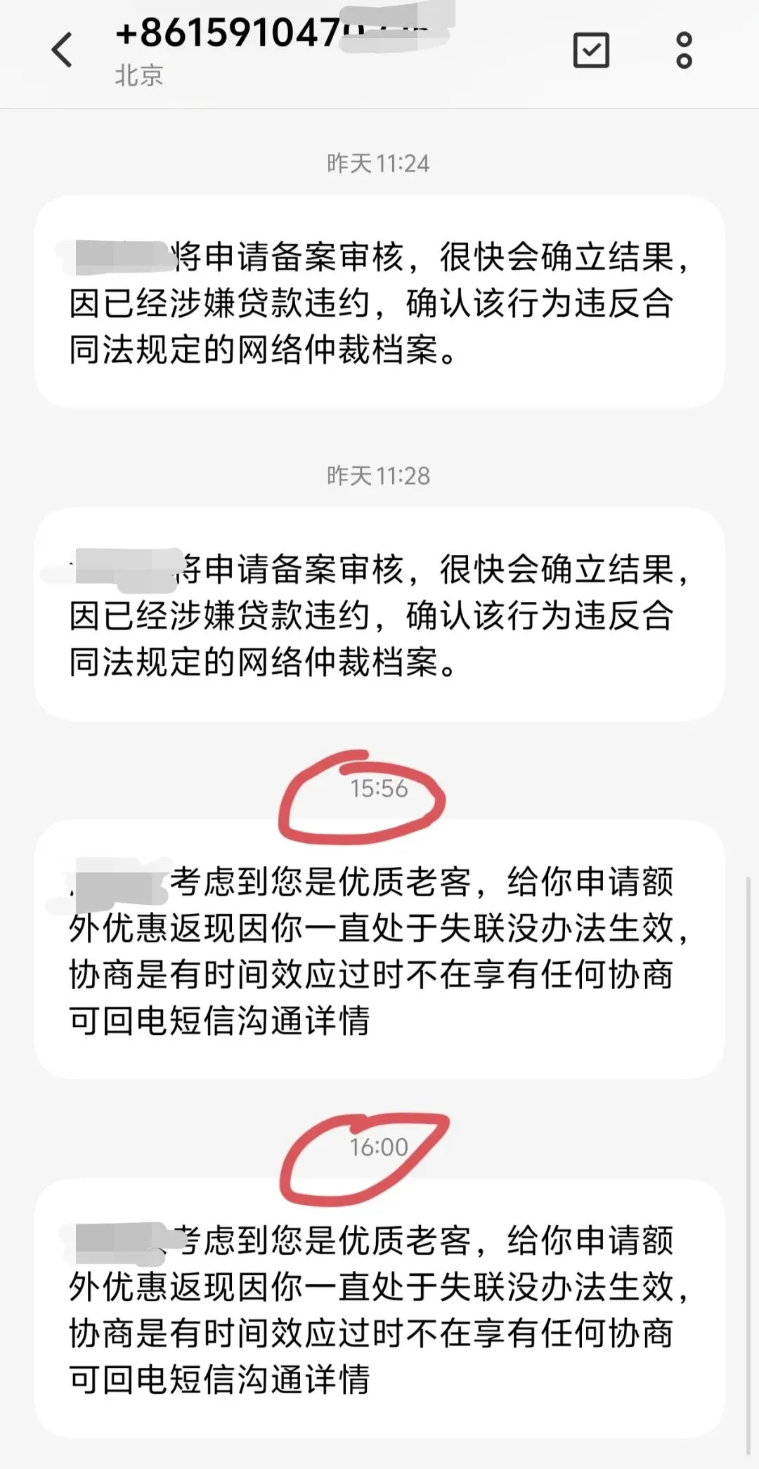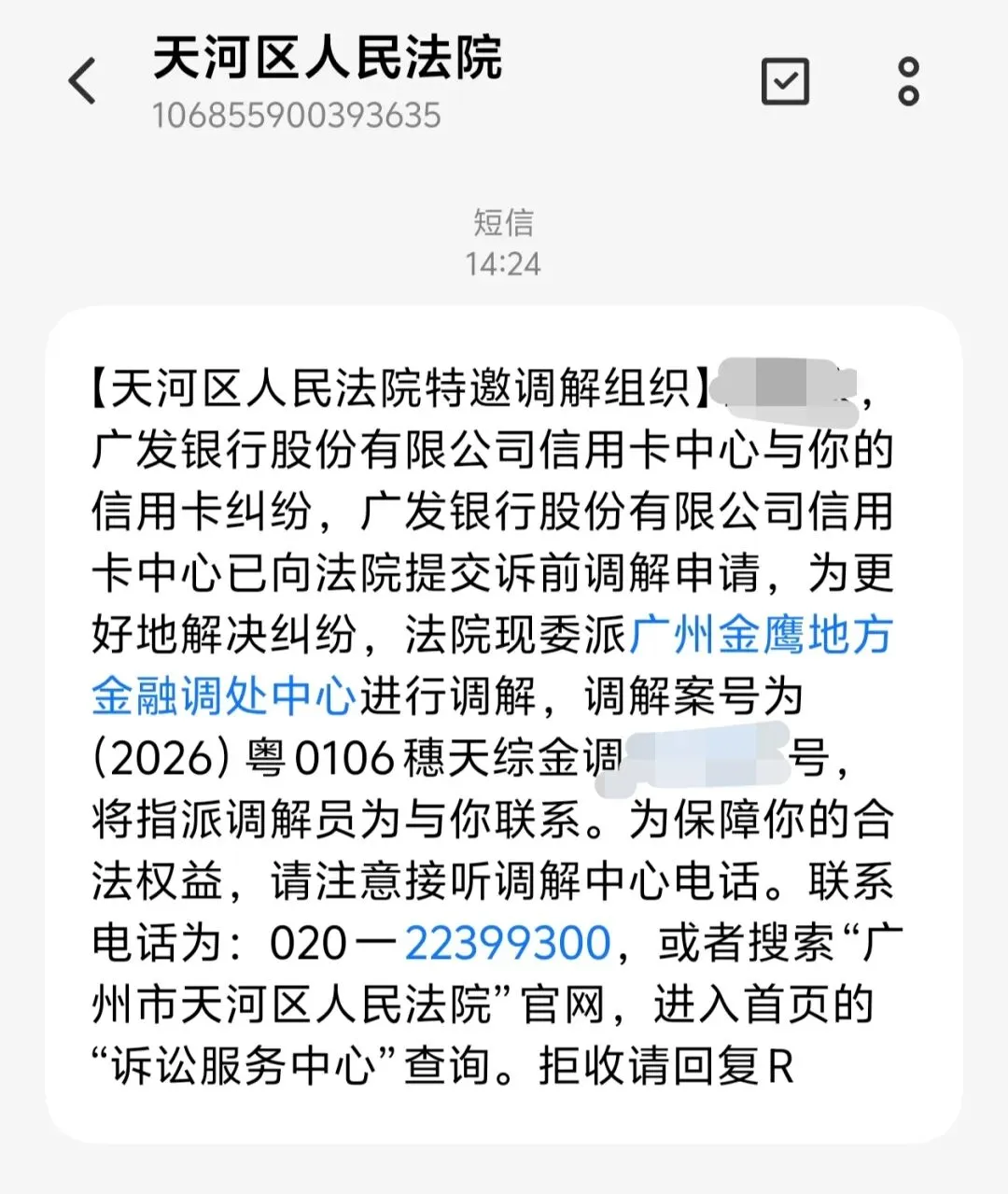 另外,今天又收到广某发的调解短信,一样的短信收到第三次了,但也没见有短信上的号码打电话过来,难道调解短信也是系统集中发送的吗,费解。
