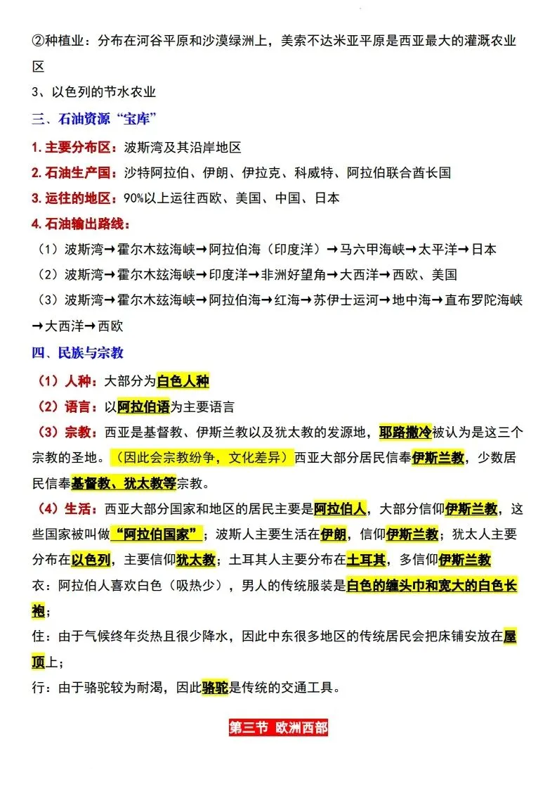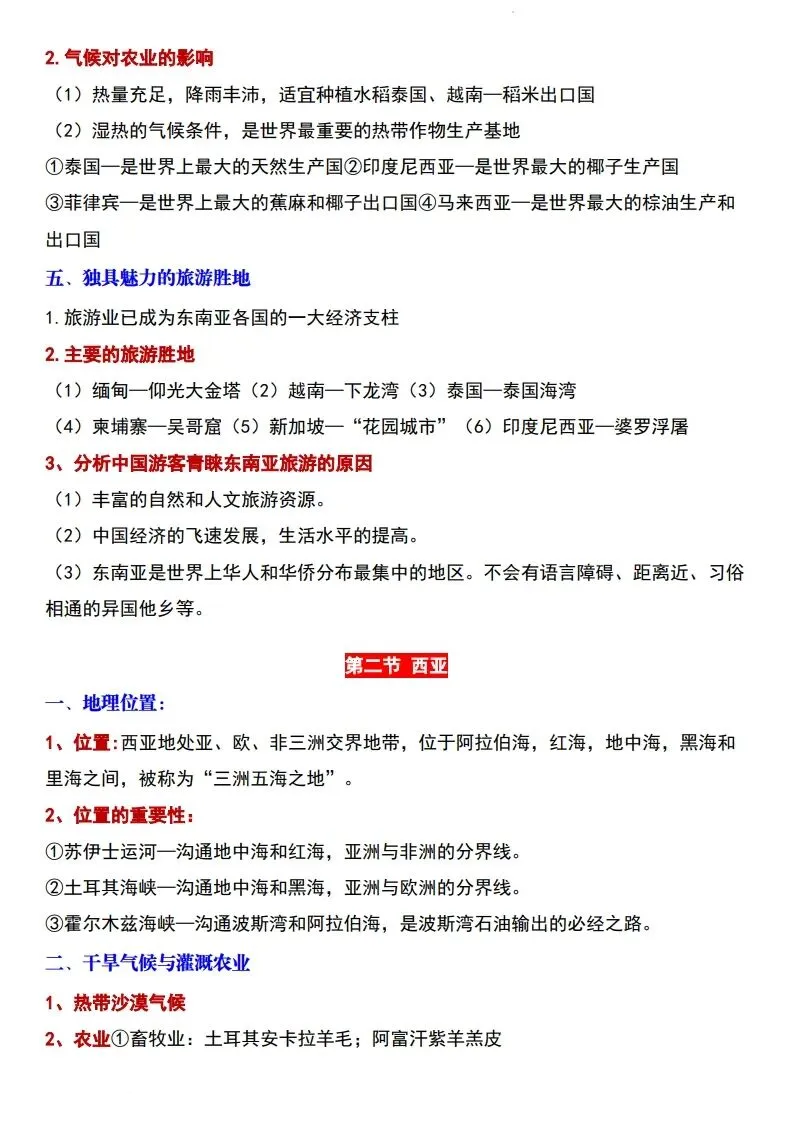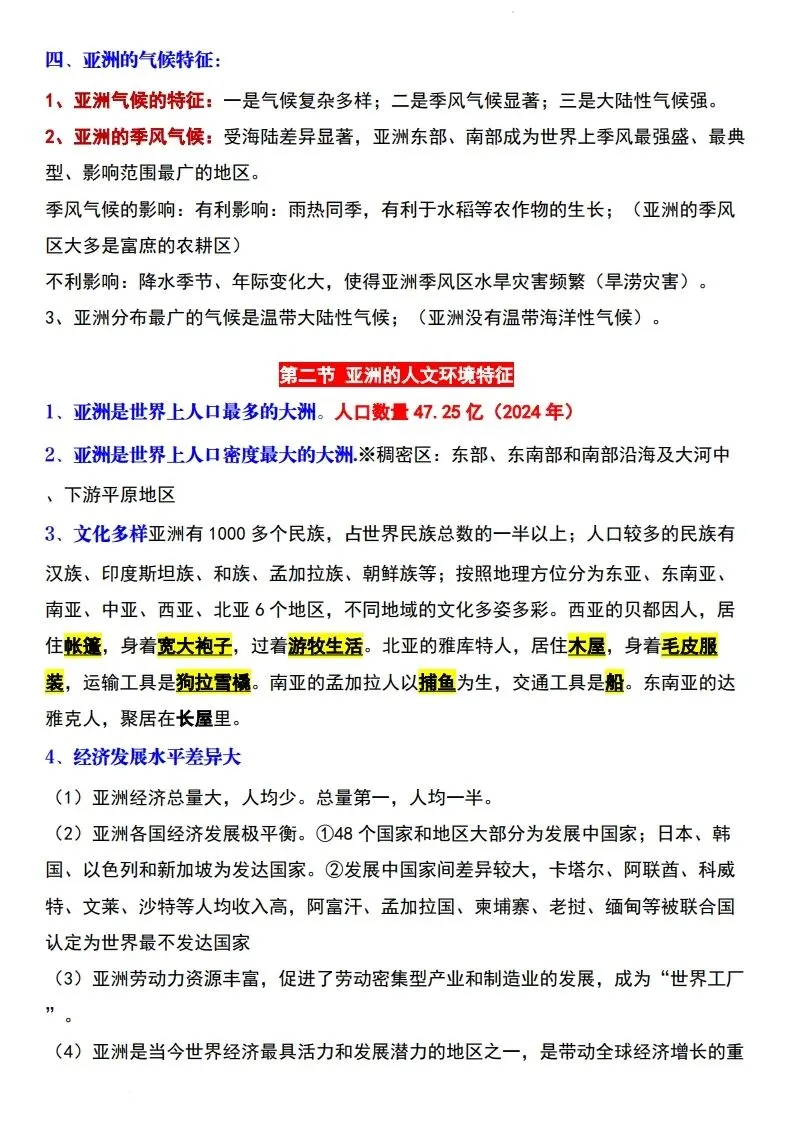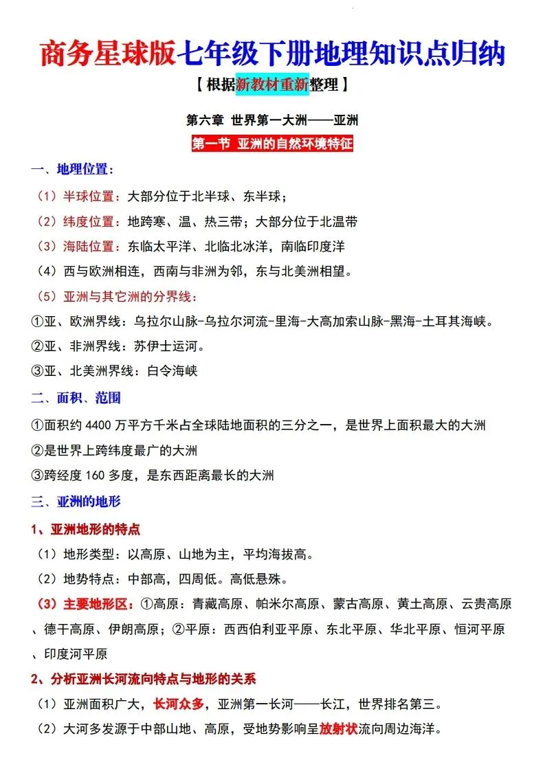 2026年七年级下册新版星球版地理全册必背知识点汇总,电子版可打印使用!