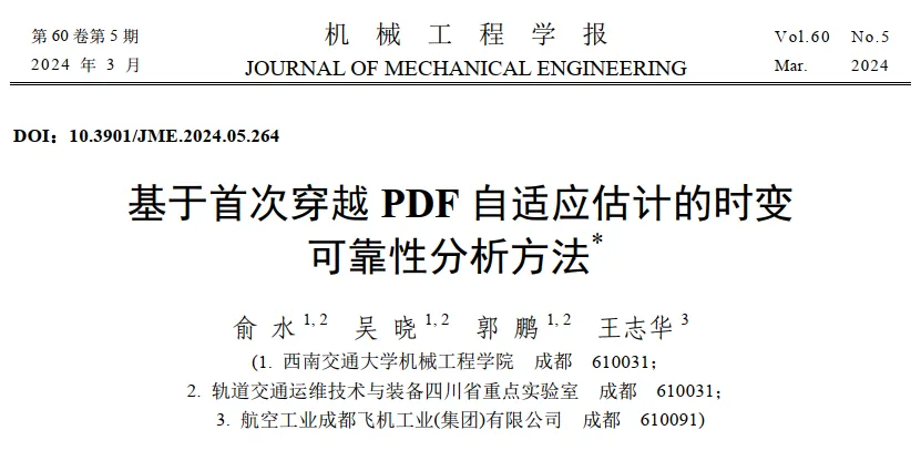引用格式:俞水,吴晓,郭鹏,等.基于首次穿越PDF自适应估计的时变可靠性分析方法[J].机械工程学报,2024,60(05):264-275.