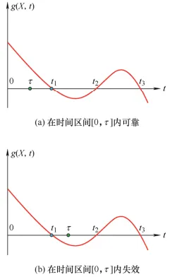 对于首次穿越法,核心在于寻找性能函数g(X,t)首次从安全域穿越到失效域的时间点t1(如图1所示)。由于t1是输入随机变量X的函数,记为ft=Ψ(X)。产品在时间区间[0,τ]的失效概率即可简化为首穿点落在该区间的概率: