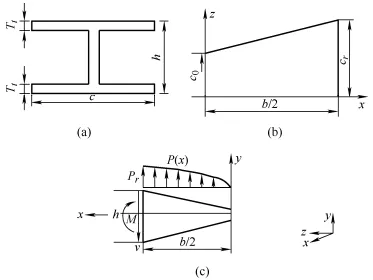 文章算例考虑波音767中典型的远程运输机机翼结构。图3a为参考机翼截面视图,其中Tt、h和c分别为翼的厚度、深度和弦长。图3b是机翼的俯视图,其中b为跨度,b=40m。图3c显示了机翼上的载荷分布情况。
