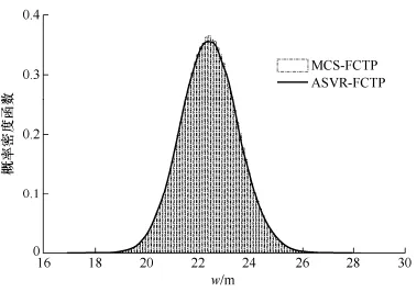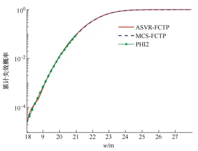 此外,在所提方法中,共经过7次迭代,利用55个训练样本,调用1006次性能函数可以达到收敛。在MCS方法中,仿真样本的个数为106个,共调运性能函数的次数为1.83×107次。在PHI2方法中,只估计[18,21]的失效概率变化,将区间[18,21]离散成50等分,共调运性能函数次数约为214500,且只能计算等分点处的失效概率。显然,本文所提方法的计算效率远高于MCS和PHI2方法。再次证明,本文所提方法能够在保证累计失效概率精度的前提下,展现巨大的计算效率优势。