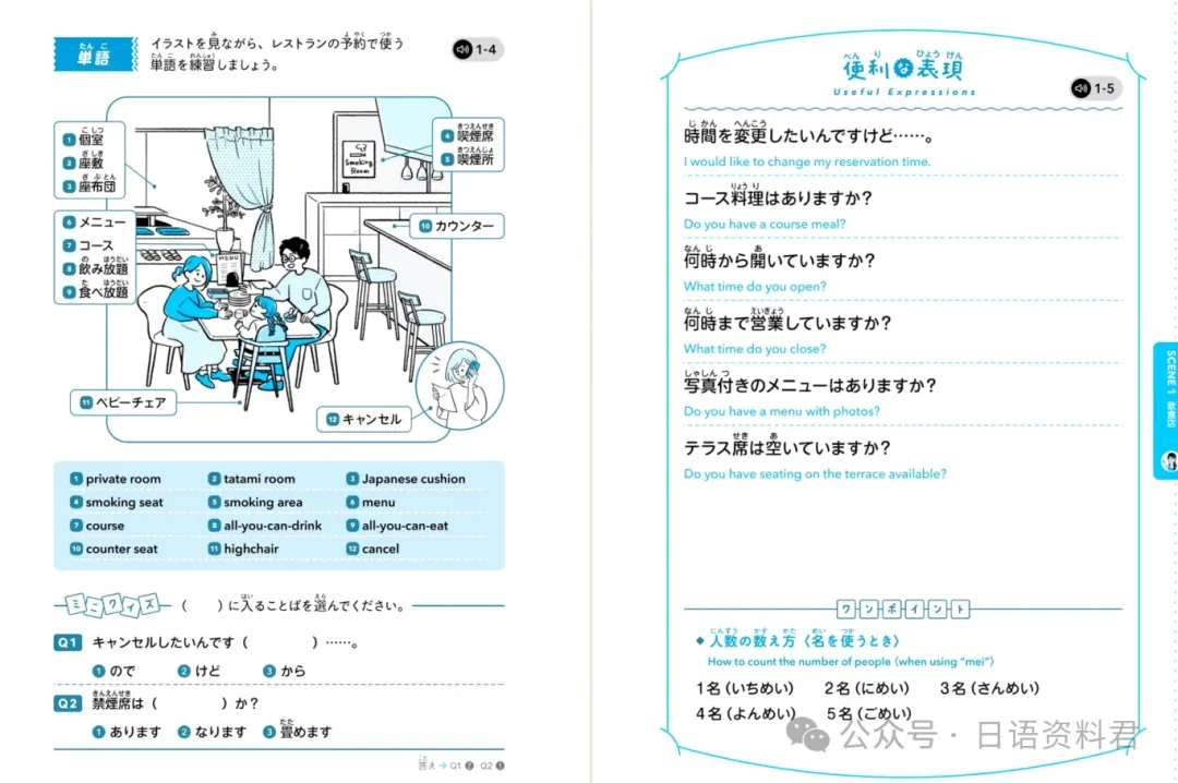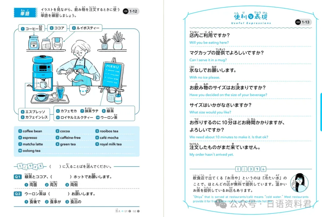 每一段日语对话都配有:地道日语原声(可扫码或下载音频);中文 + 英文双语翻译(三语对照,零基础友好);重点词汇解析(标音+词性+用法);趣味小练习(填空、配对、角色扮演,像玩游戏一样巩固)。
