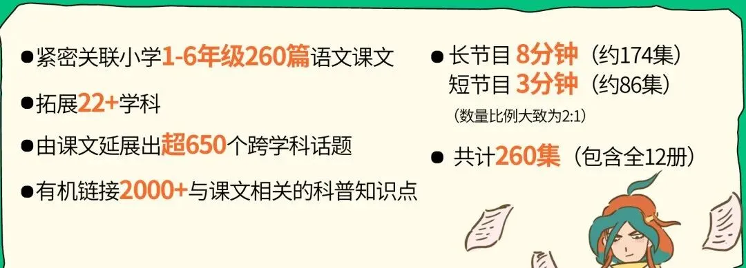 除了有趣的动画让孩子们爱上主动学语文,这套大语文覆盖了1-6年级语文课本中所有现代文(人教统编版)的科普动画,一篇一集,一集8分钟,整整260集 。
