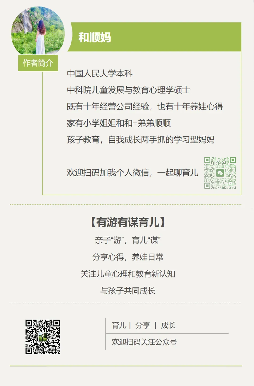 大家好,我是和顺妈,新手心理咨询师,育儿教育领域写作多年,目前全网粉丝9万+,感谢这么多云闺蜜的关注。我组建了【和顺妈育儿教育群】,可互动交流,分享经验,抱团成长,目前入群免费,后面会根据情况收费,先到先得。大家可扫描下面绿色二维码或输入微信号stones216加我微信(请备注:入群)邀请您加入。