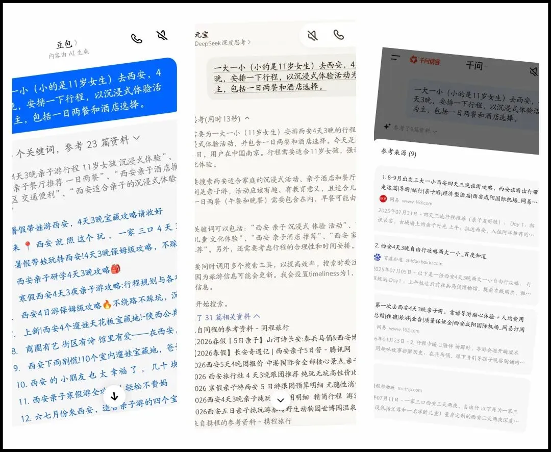 正准备春假带女儿去趟西安,同样的问题喂给各大AI,顺便观察一下各自的信息源: