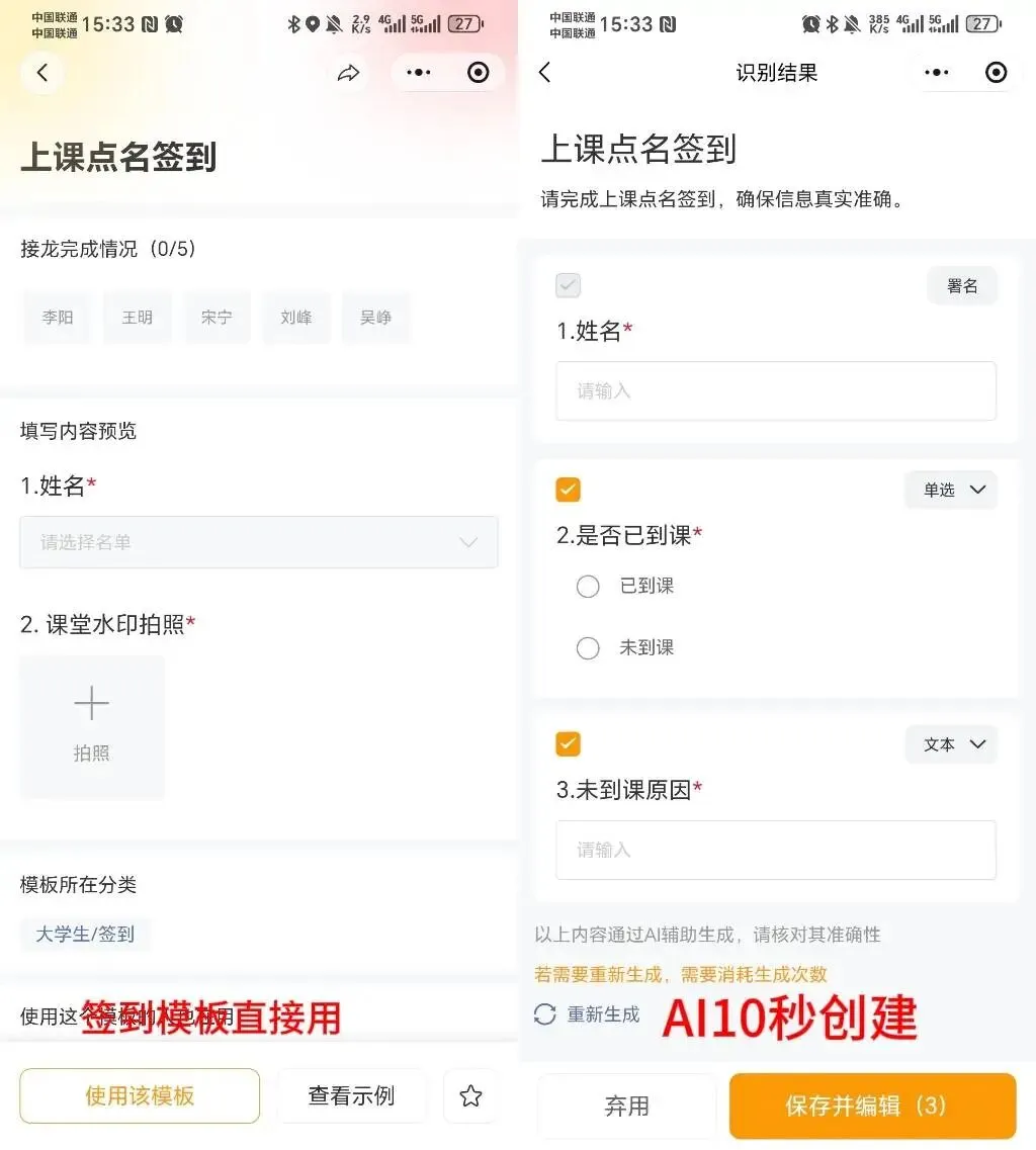 创建签到也非常简单,有现成的签到模板可以直接用,更贴心的是,它还支持Al一句话生成签到接龙,学生只需点击链接或扫描二维码,就能进入签到页面,按照提示完成签到。整个过程流畅便捷,30秒就搞定,大大节省了签到的时间。
