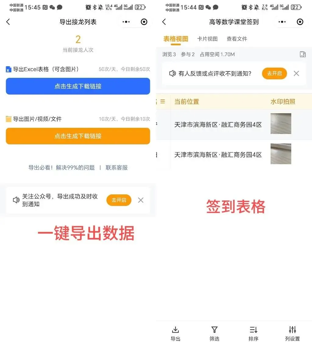 签到结束后,接龙管家会自动统计签到数据,生成详细的出勤表,表中包含学生签到时间,签到地点,签到照片等信息,可直接发给学校存档。班委们再也不用手动统计名单,大大减轻了工作负担。
