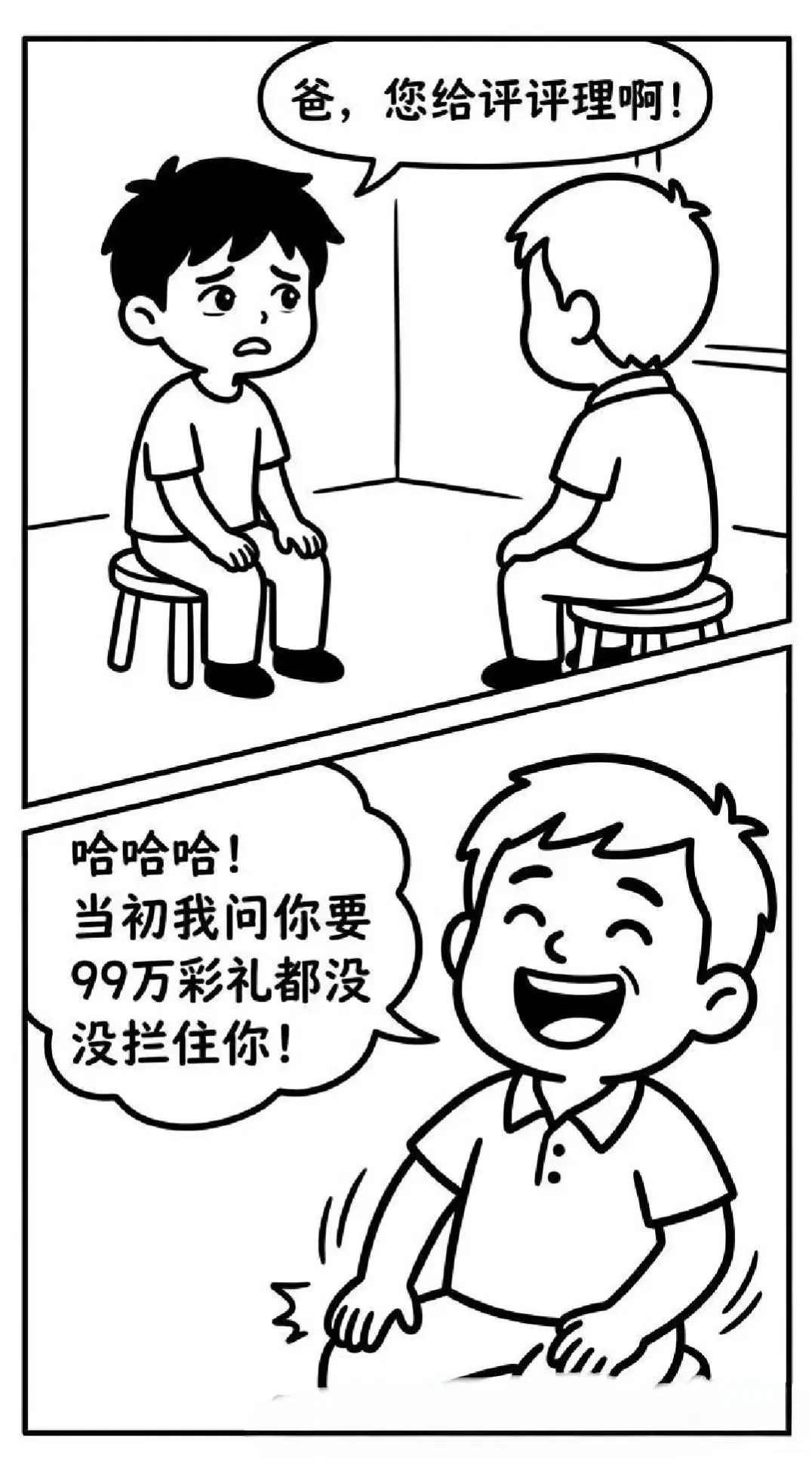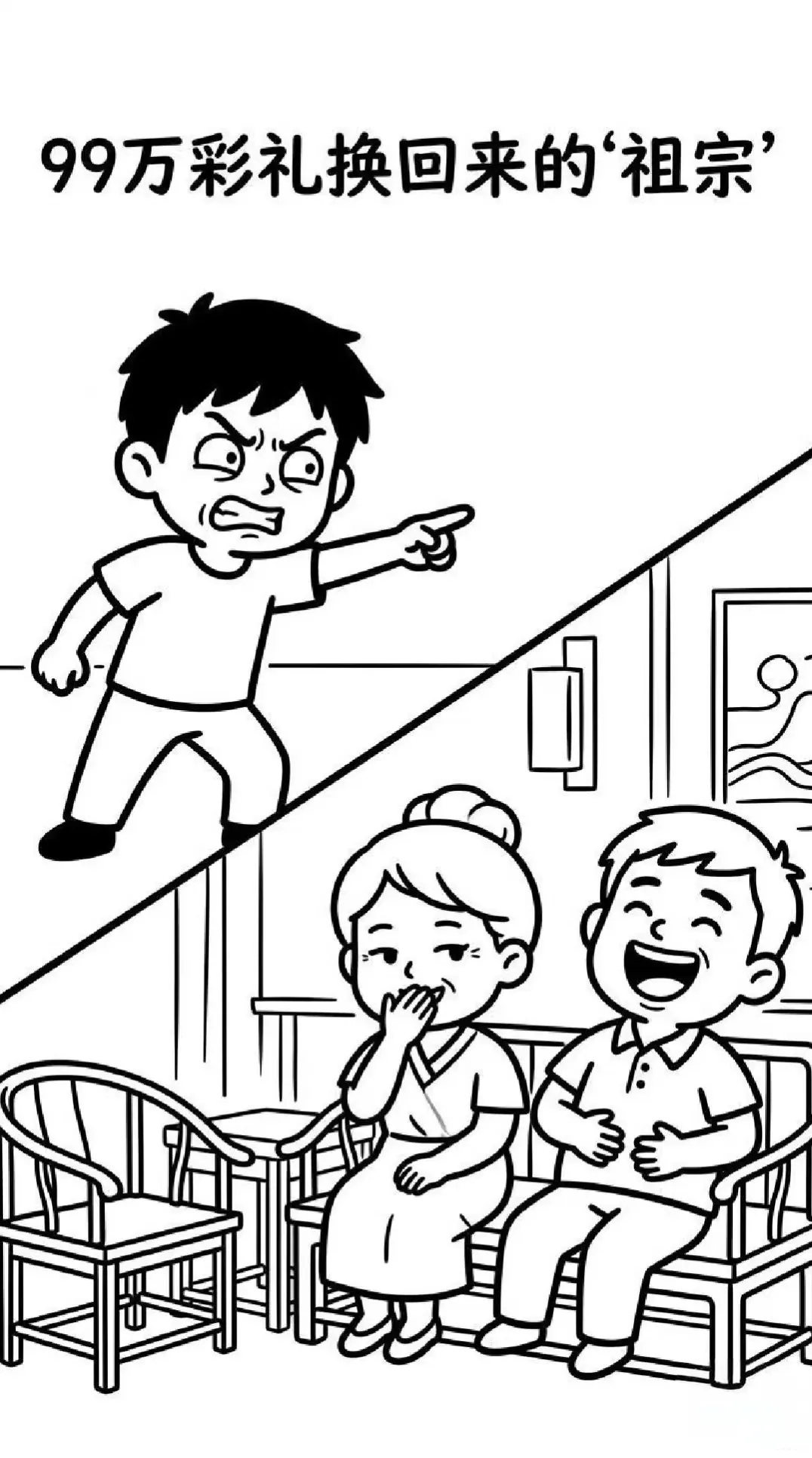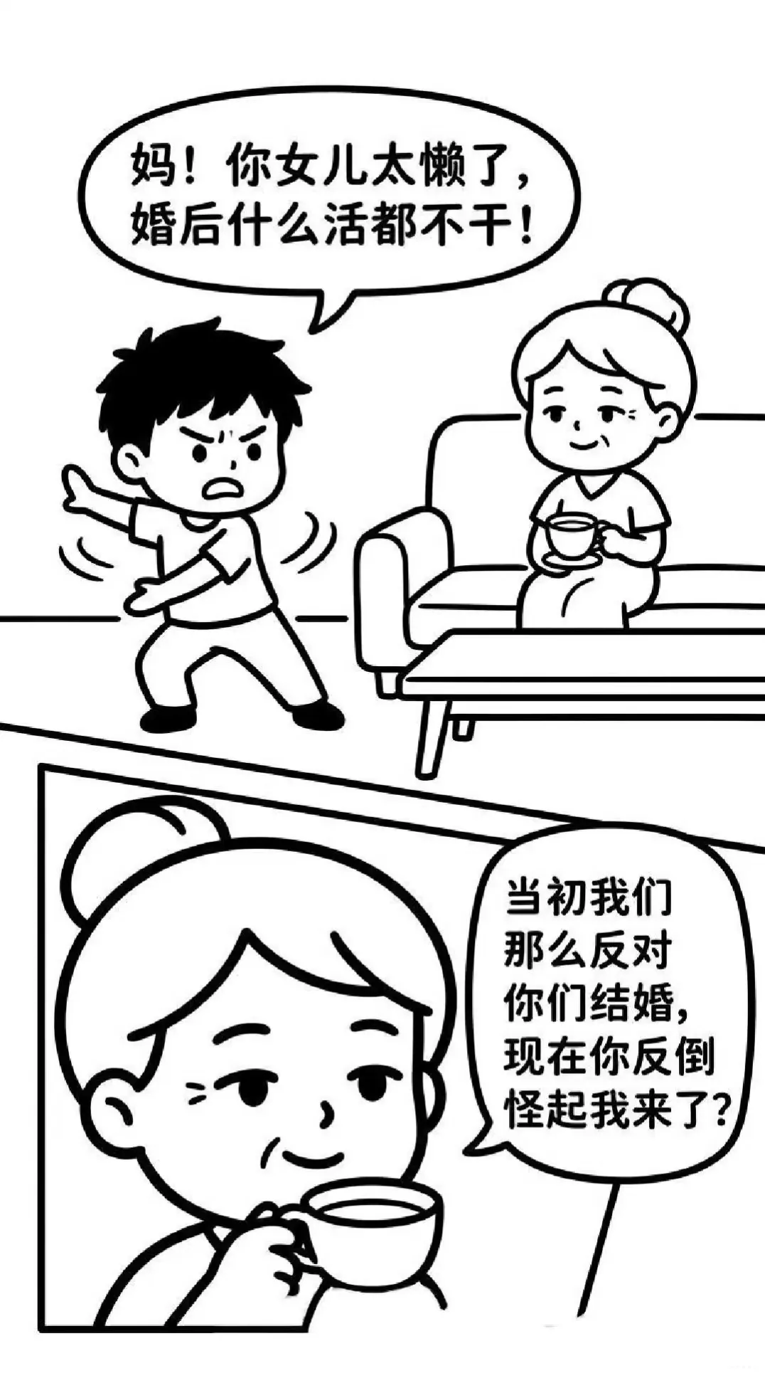 趣味漫画:女婿:妈,你家女儿懒死了结了婚什么都不干.丈母娘:怪我喽,当初不让你俩结婚搞得我像害你一样.老丈人:99万彩礼都没拦住你